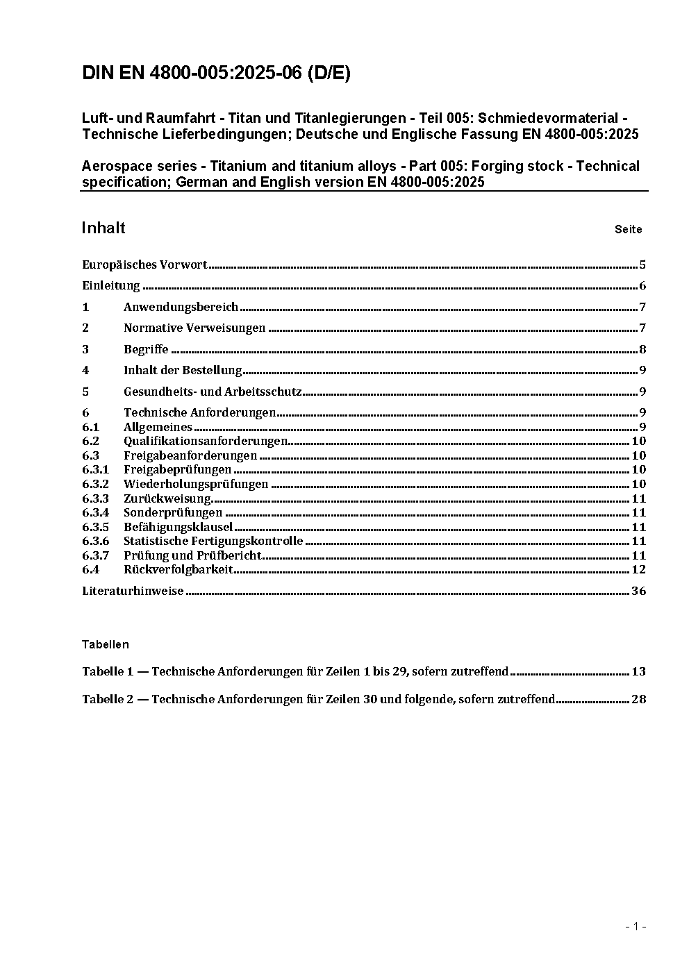 Luft- und Raumfahrt - Titan und Titanlegierungen - Technische Lieferbedingungen - Teil 005: Schmiedevormaterial; Deutsche und Englische Fassung EN 4800-005:2010