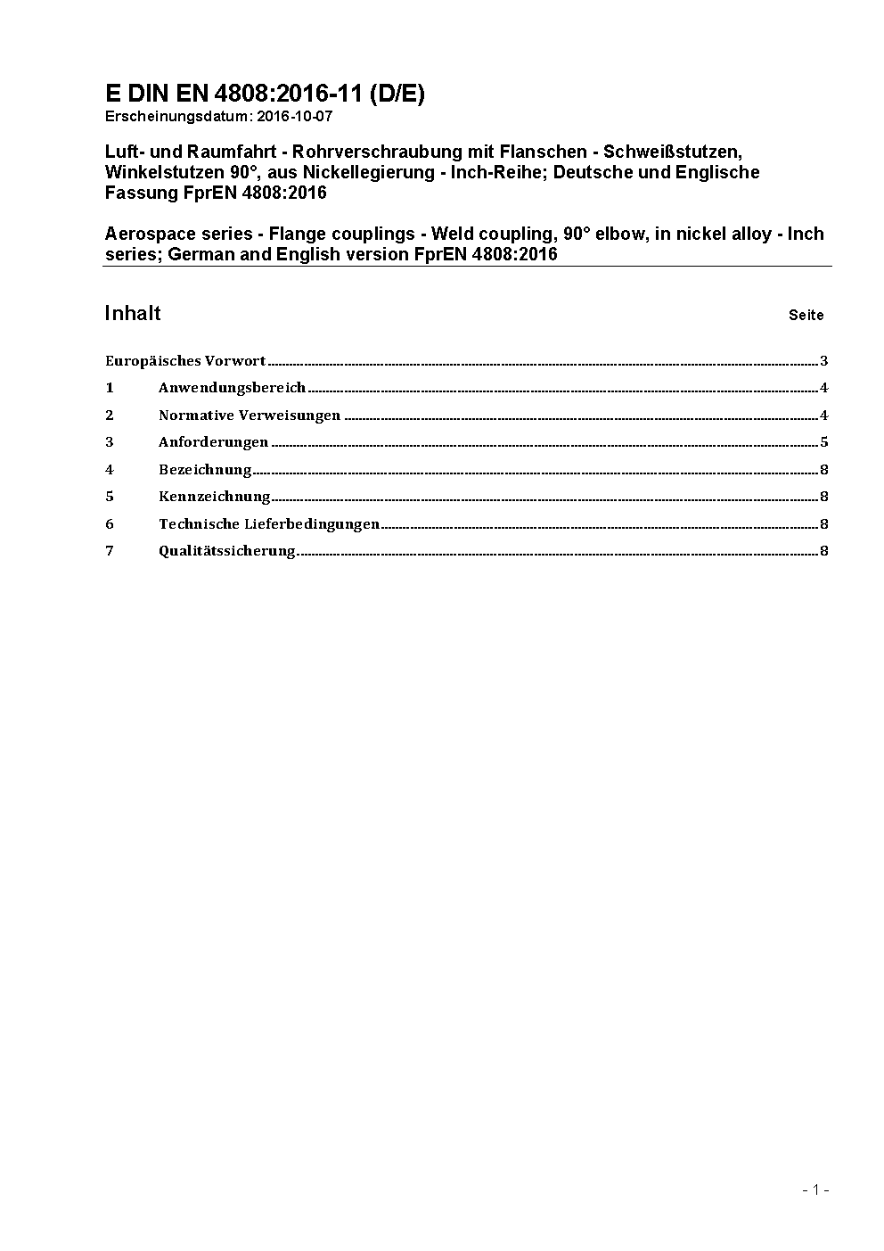 Luft- und Raumfahrt - Rohrverschraubung mit Flanschen - Schweißstutzen, Winkelstutzen 90°, aus Nickellegierung - Inch-Reihe; Deutsche und Englische Fassung FprEN 4808:2016