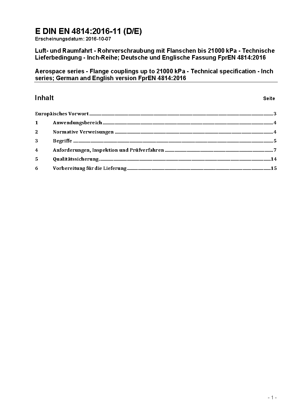 Luft- und Raumfahrt - Rohrverschraubung mit Flanschen bis 21000 kPa - Technische Lieferbedingung - Inch-Reihe; Deutsche und Englische Fassung FprEN 4814:2016