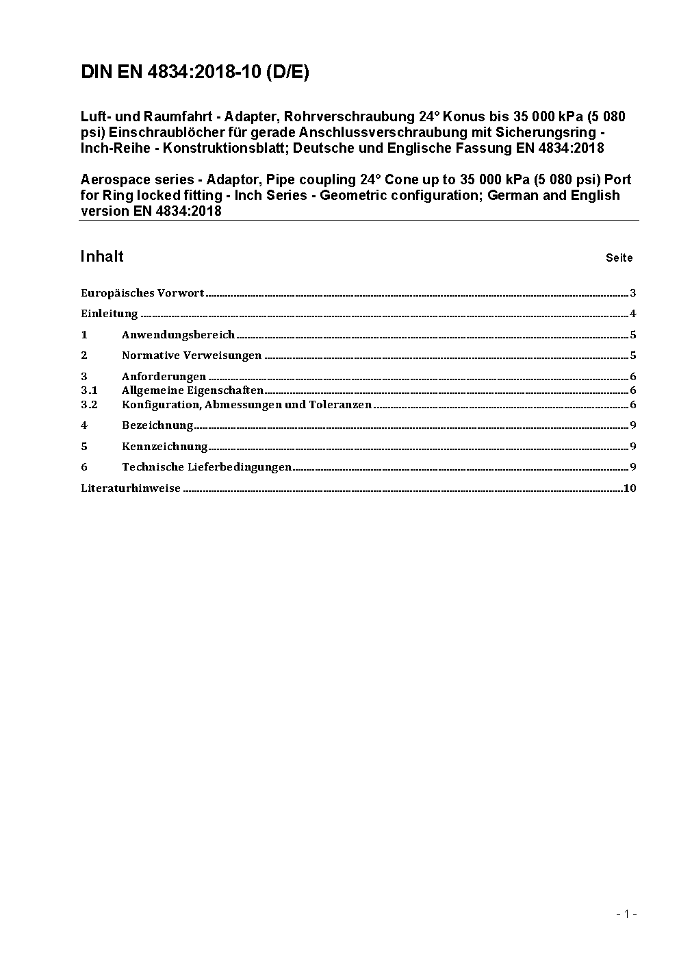 Luft- und Raumfahrt - Adapter, Rohrverschraubung 24° Konus bis 35000 kPa (5080 psi) Einschraublöcher für gerade Anschlussverschraubung mit Sicherungsring - Inch-Reihe - Konstruktionsblatt; Deutsche und Englische Fassung FprEN 4834:2017