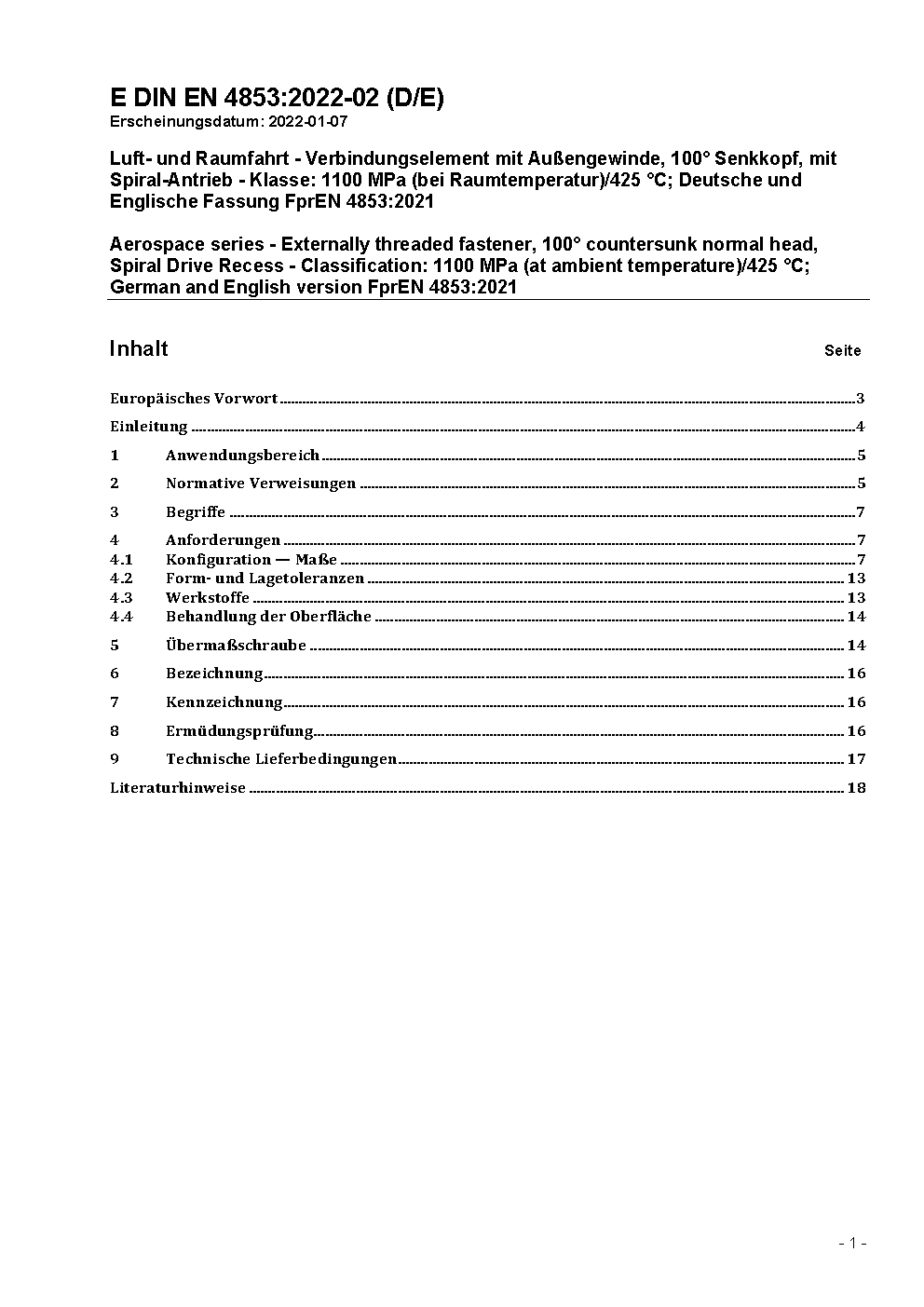 Luft- und Raumfahrt - Verbindungselement mit Außengewinde, 100°-Senkkopf, mit Spiral-Antrieb - Klasse: 1 100 MPa (bei Raumtemperatur)/425 °C; Deutsche und Englische Fassung EN 4853:2022