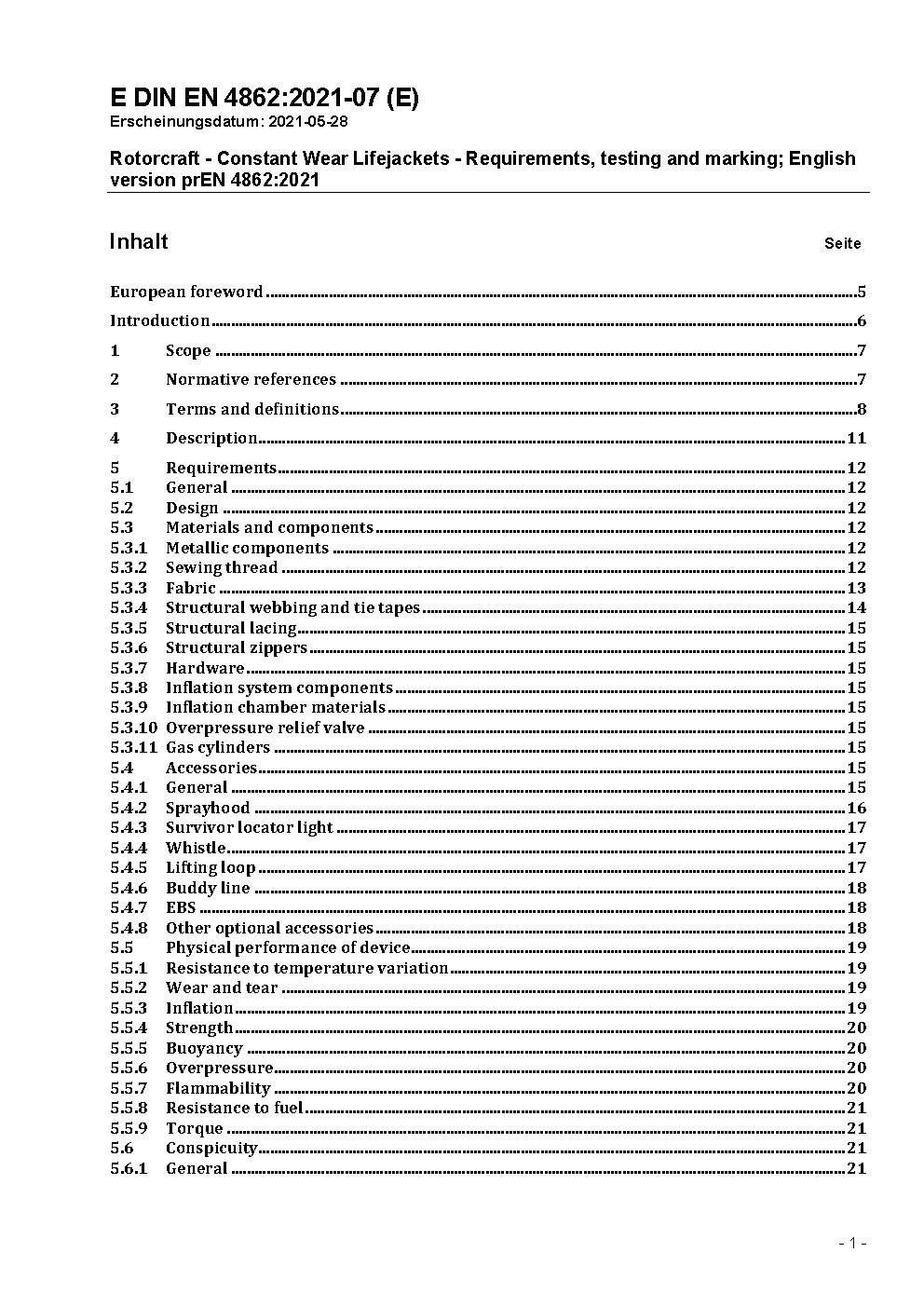 Luft- und Raumfahrt – Drehflügler - Rettungswesten zum ständigen Tragen – Anforderungen, Prüfung und Kennzeichnung; Englische Fassung prEN 4862:2021