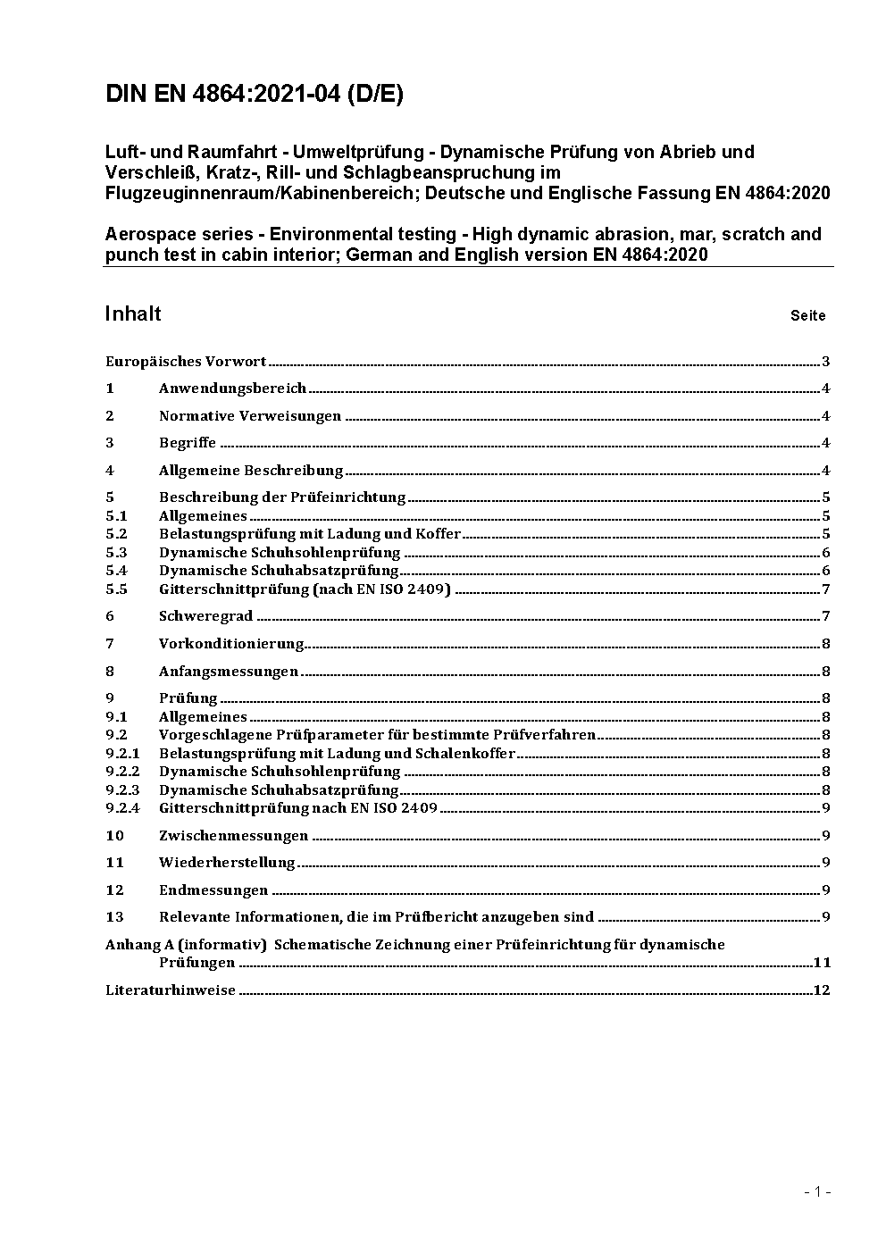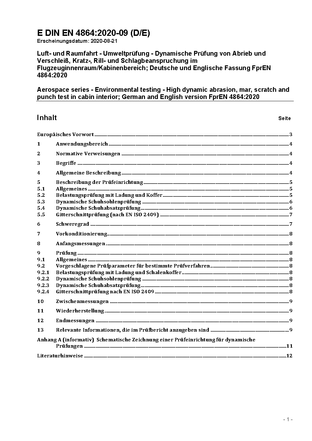 Luft- und Raumfahrt - Umweltprüfung - Dynamische Prüfung von Abrieb und Verschleiß, Kratz-, Rill- und Schlagbeanspruchung im Flugzeuginnenraum/Kabinenbereich; Deutsche und Englische Fassung FprEN 4864:2020