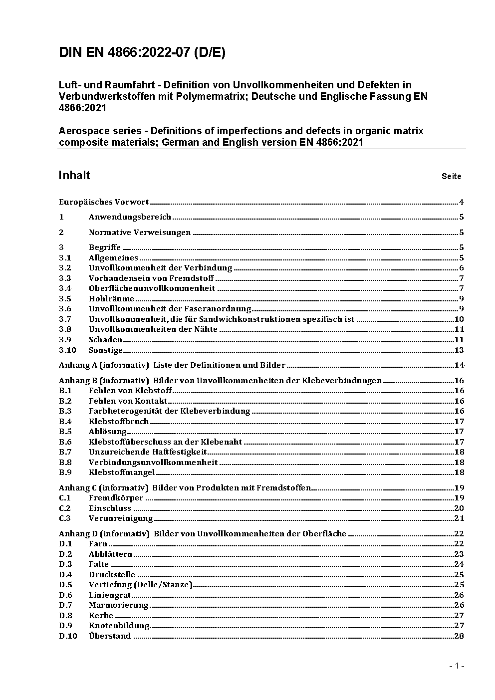 Luft- und Raumfahrt - Definition von Unvollkommenheiten und Defekten in Verbundwerkstoffen mit Polymermatrix; Deutsche und Englische Fassung EN 4866:2021