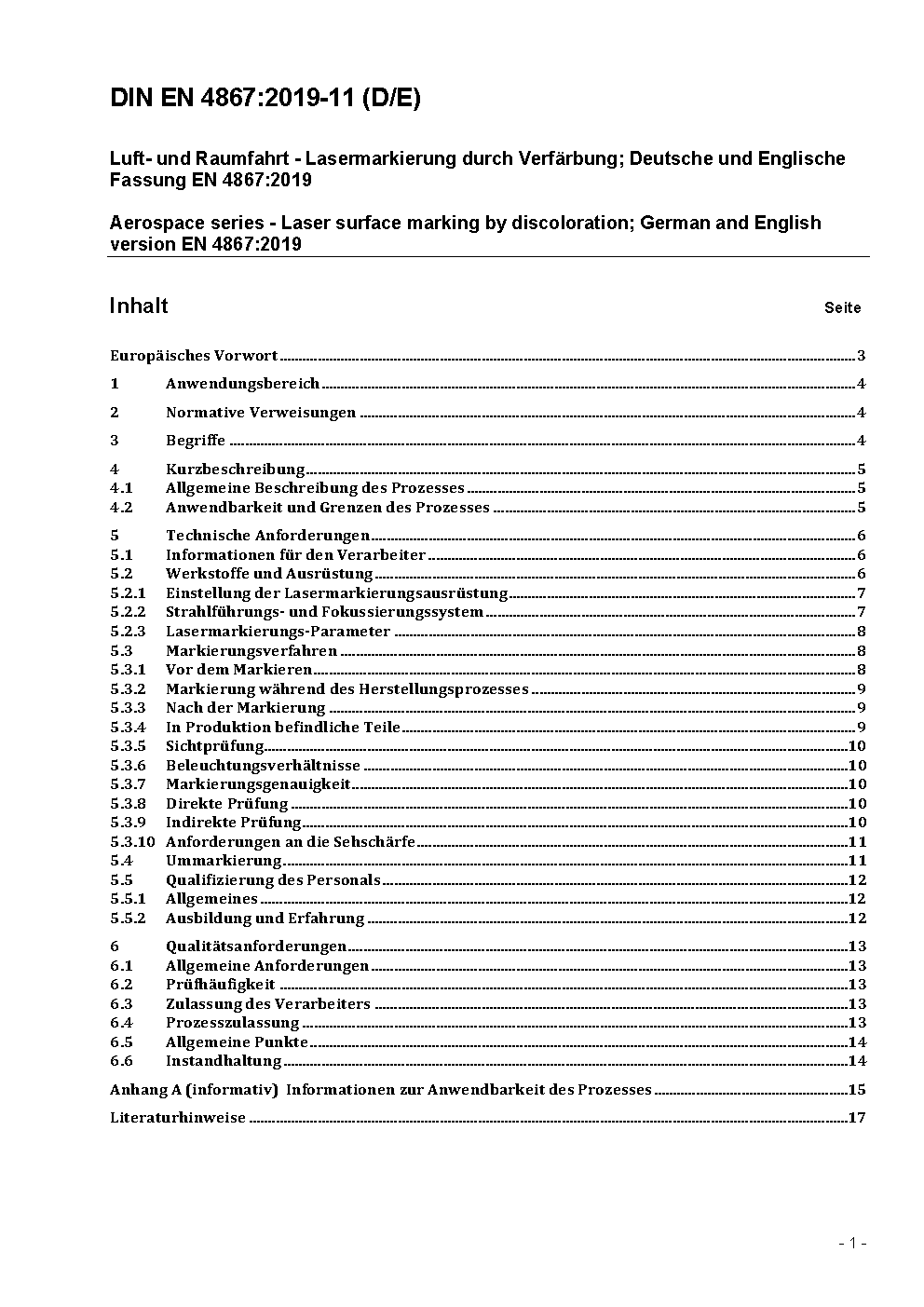 Luft- und Raumfahrt - Lasermarkierung durch Verblassen; Deutsche und Englische Fassung FprEN 4867:2018