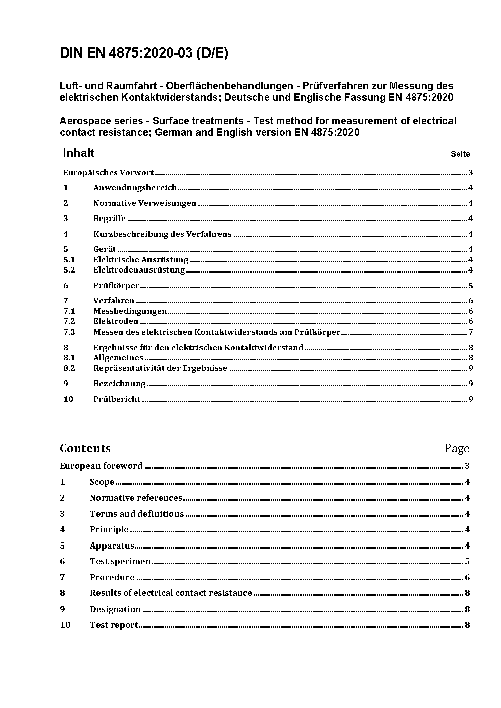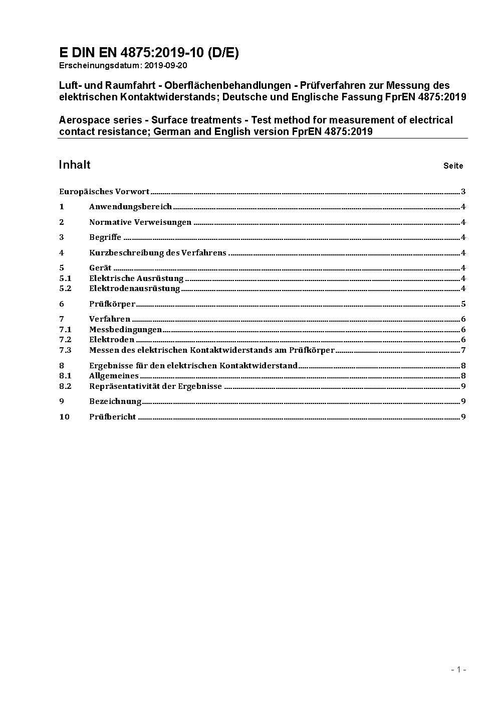 Luft- und Raumfahrt - Oberflächenbehandlungen - Prüfverfahren zur Messung des elektrischen Kontaktwiderstands; Deutsche und Englische Fassung FprEN 4875:2019