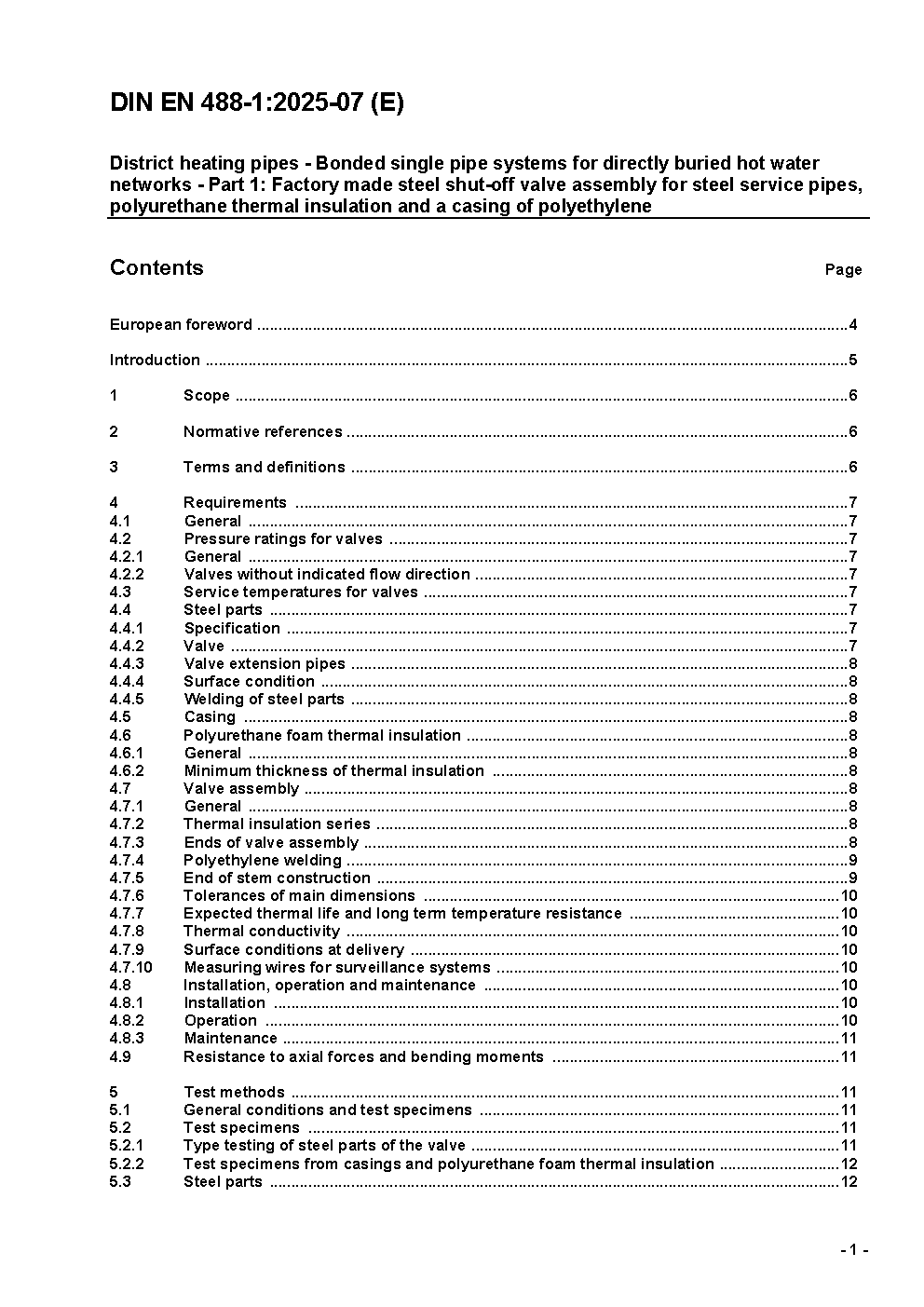 District heating pipes - Bonded single pipe systems for directly buried hot water networks - Part 1: Factory made steel valve assembly for steel service pipes, polyurethane thermal insulation and a casing of polyethylene; German and English version prEN 488-1:2023