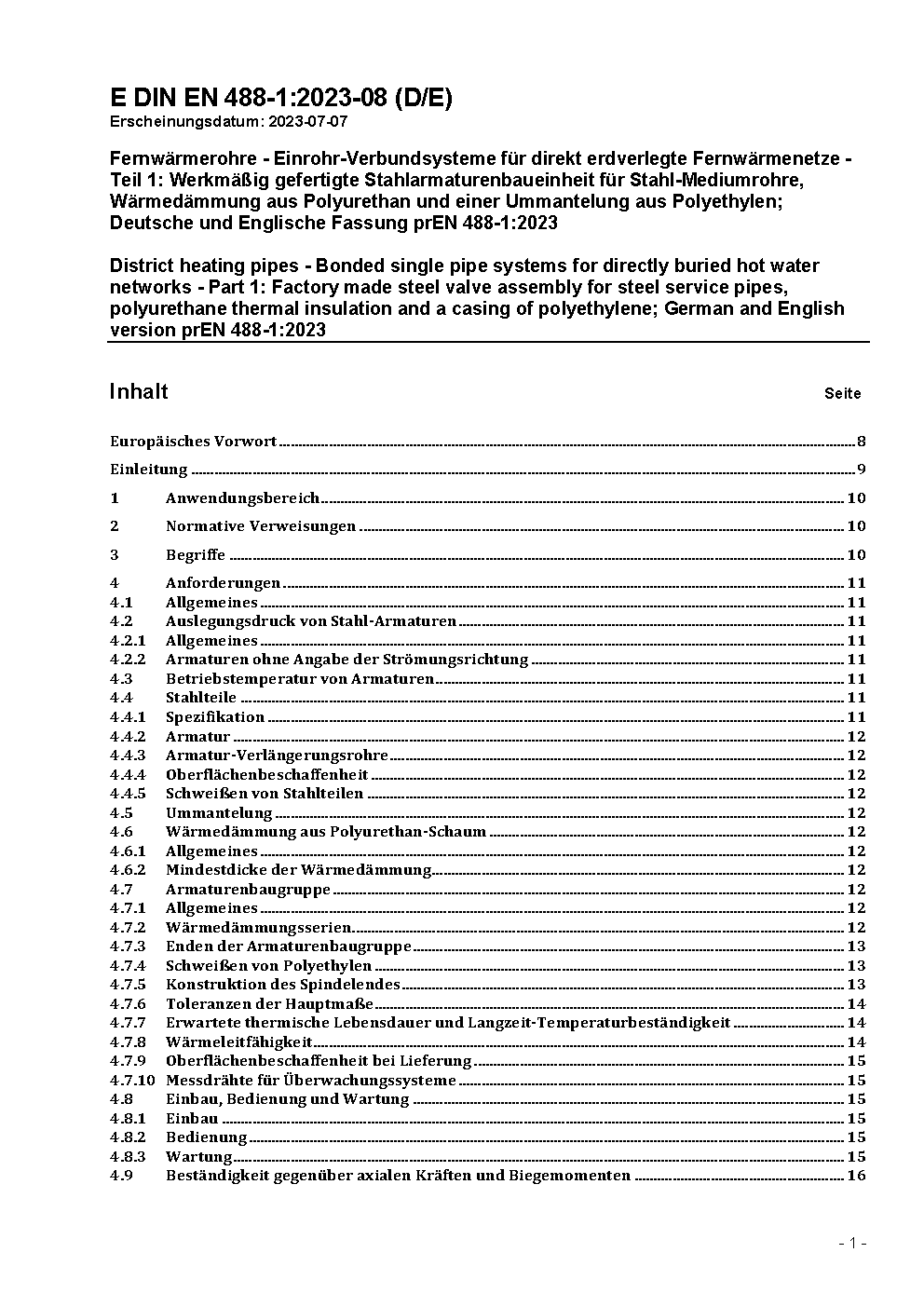 Fernwärmerohre - Einrohr-Verbundsysteme für direkt erdverlegte Fernwärmenetze - Teil 1: Werkmäßig gefertigte Stahlarmaturenbaueinheit für Stahl-Mediumrohre, Wärmedämmung aus Polyurethan und einer Ummantelung aus Polyethylen; Deutsche und Englische Fassung prEN 488-1:2023