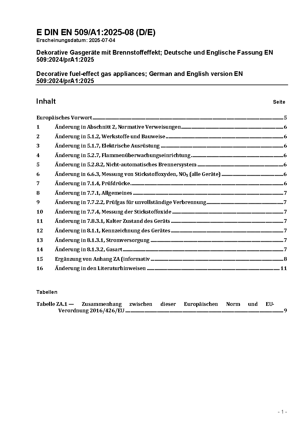 Dekorative Gasgeräte mit Brennstoffeffekt; Änderung A1; Deutsche Fassung EN 509:1999/prA1:2002