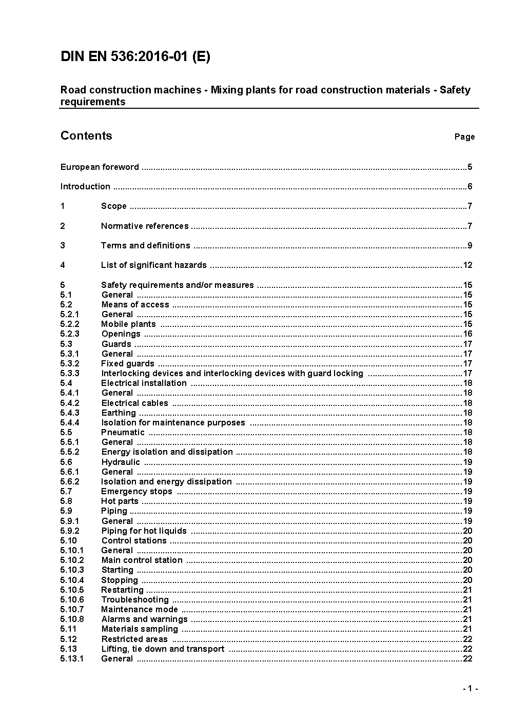 Straßenbaumaschinen - Asphaltmischanlagen - Sicherheitsanforderungen; Deutsche Fassung EN 536:1999