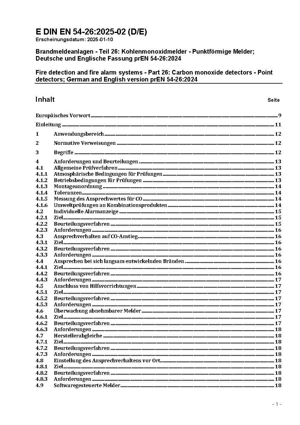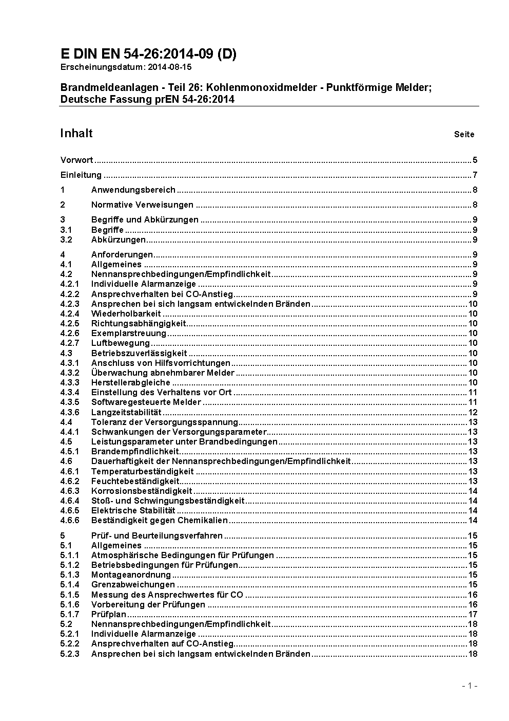 Brandmeldeanlagen - Teil 26: Kohlenmonoxidmelder - Punktförmige Melder; Deutsche Fassung prEN 54-26:2014