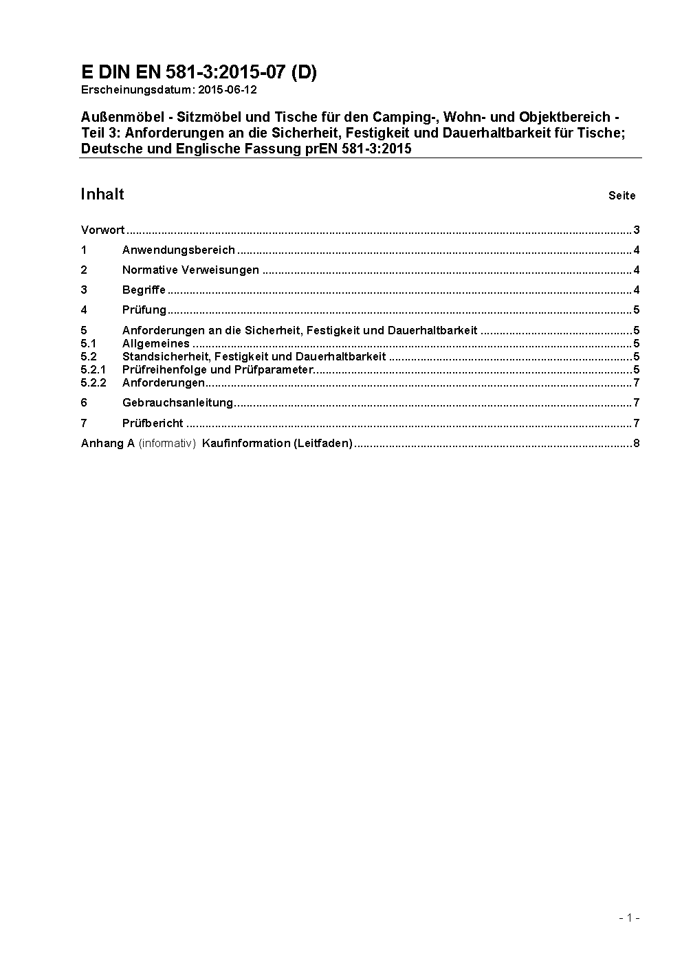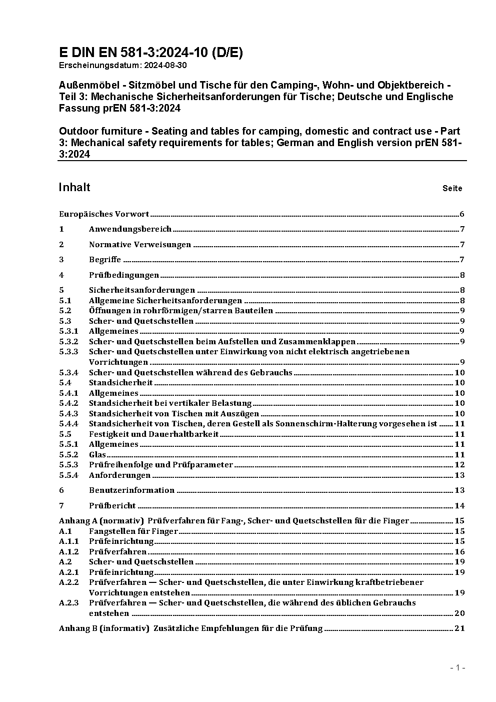 Außenmöbel - Sitzmöbel und Tische für den Camping-, Wohn- und Objektbereich - Teil 3: Mechanische Sicherheitsanforderungen für Tische; Deutsche Fassung EN 581-3:2017