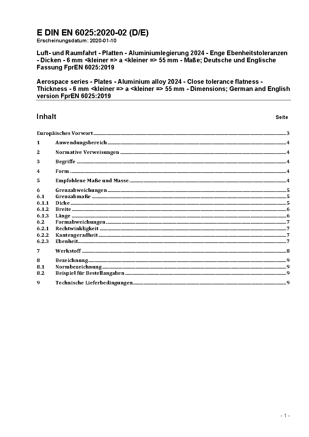 Luft- und Raumfahrt - Platten - Aluminiumlegierungen 2024, enge Ebenheitstoleranzen; Dicken 6 mm < a 55 mm; Maße