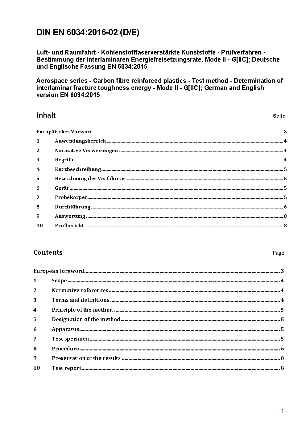 Luft- und Raumfahrt - Kohlenstofffaserverstärkte Kunststoffe - Prüfverfahren: Bestimmung der interlaminaren Energiefreisetzungsrate, Mode II - G[IIC]; Deutsche und Englische Fassung FprEN 6034:2013