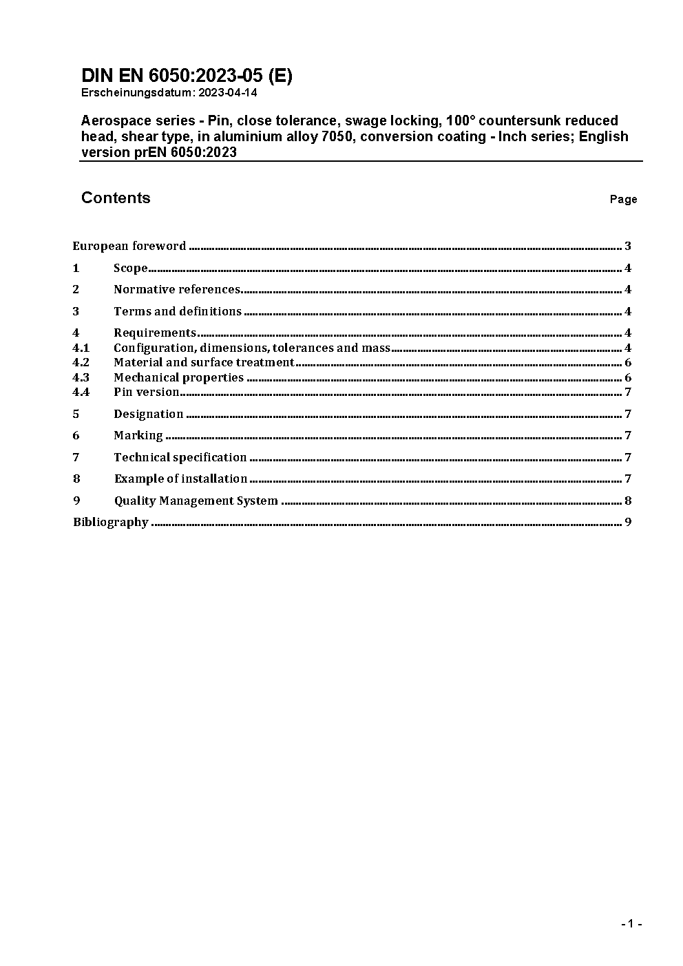 Aerospace series - Pin, close tolerance, swage locking, 100° countersunk reduced head, shear type, in aluminium alloy 7050, conversion coating - Inch series; German and English version EN 6050:2025