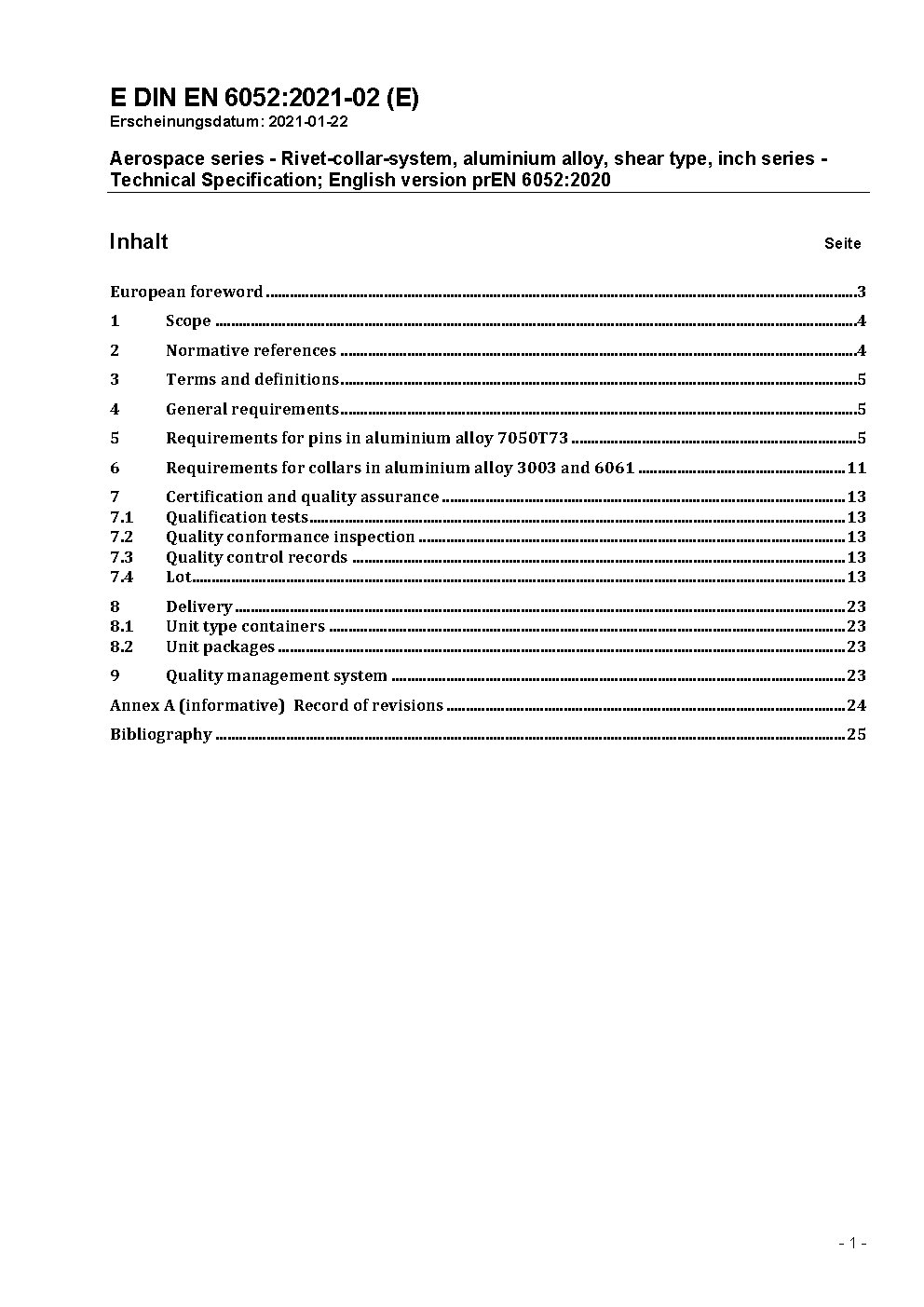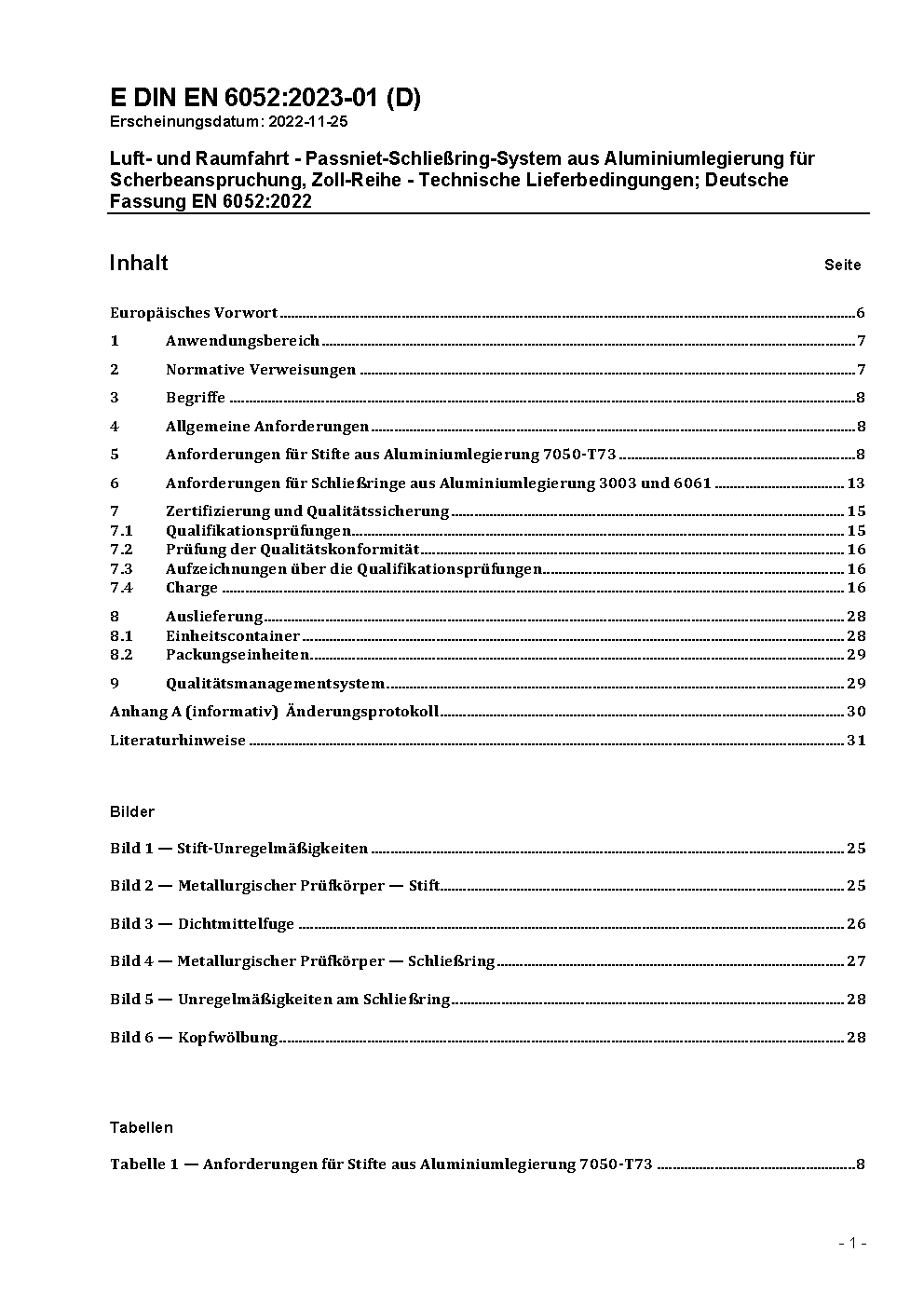 Luft- und Raumfahrt - Passniet-Schließring-System aus Aluminiumlegierung für Scherbeanspruchung, Zoll-Reihe - Technische Lieferbedingungen; Deutsche Fassung EN 6052:2022