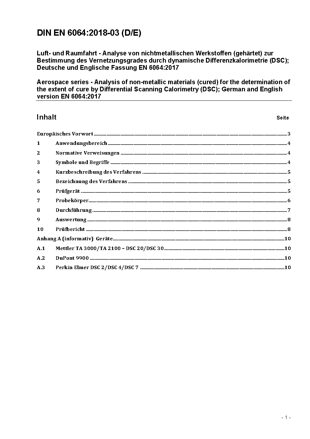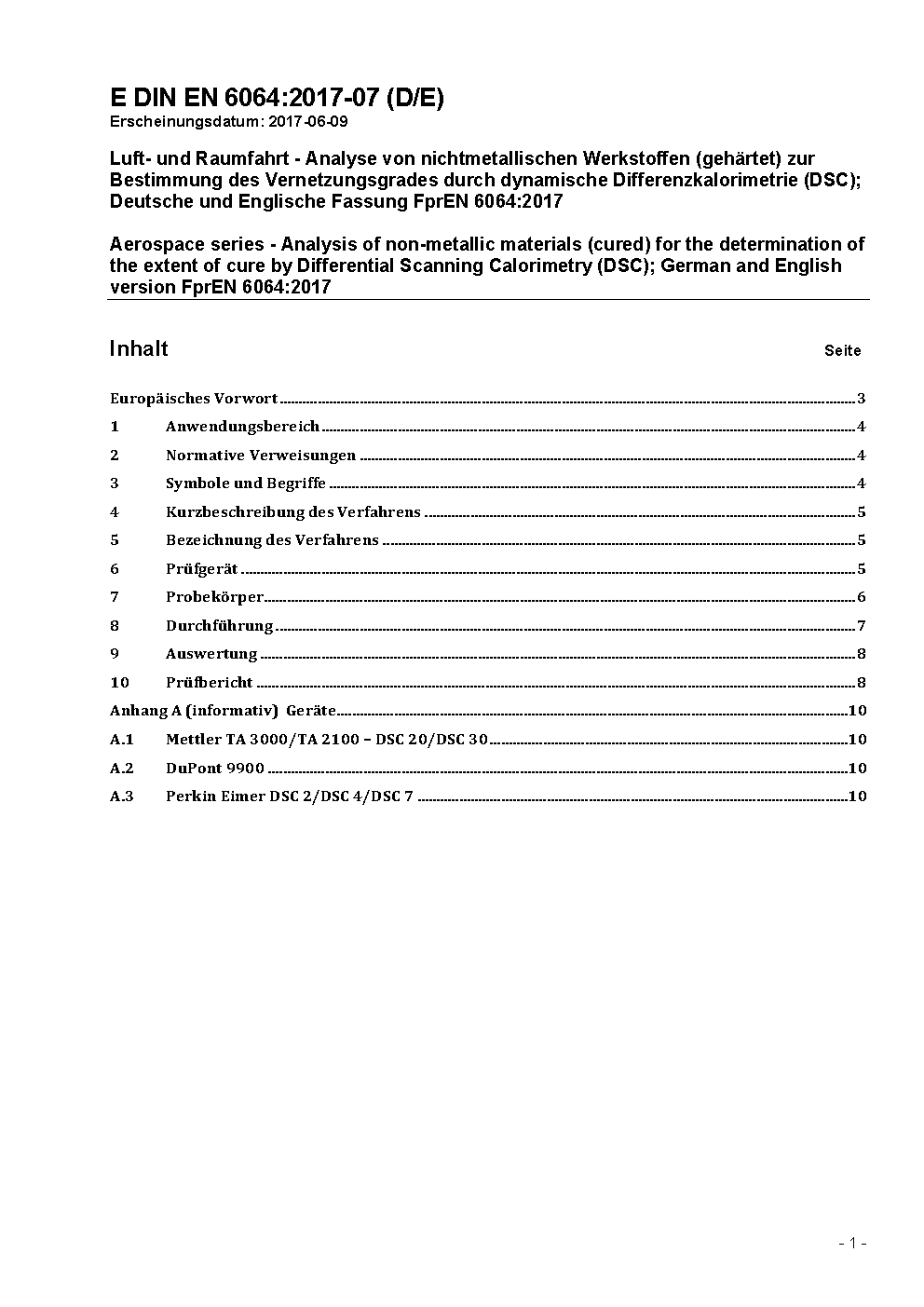 Luft- und Raumfahrt - Analyse von nichtmetallischen Werkstoffen (gehärtet) zur Bestimmung des Vernetzungsgrades durch dynamische Differenzkalorimetrie (DSC); Deutsche und Englische Fassung FprEN 6064:2017