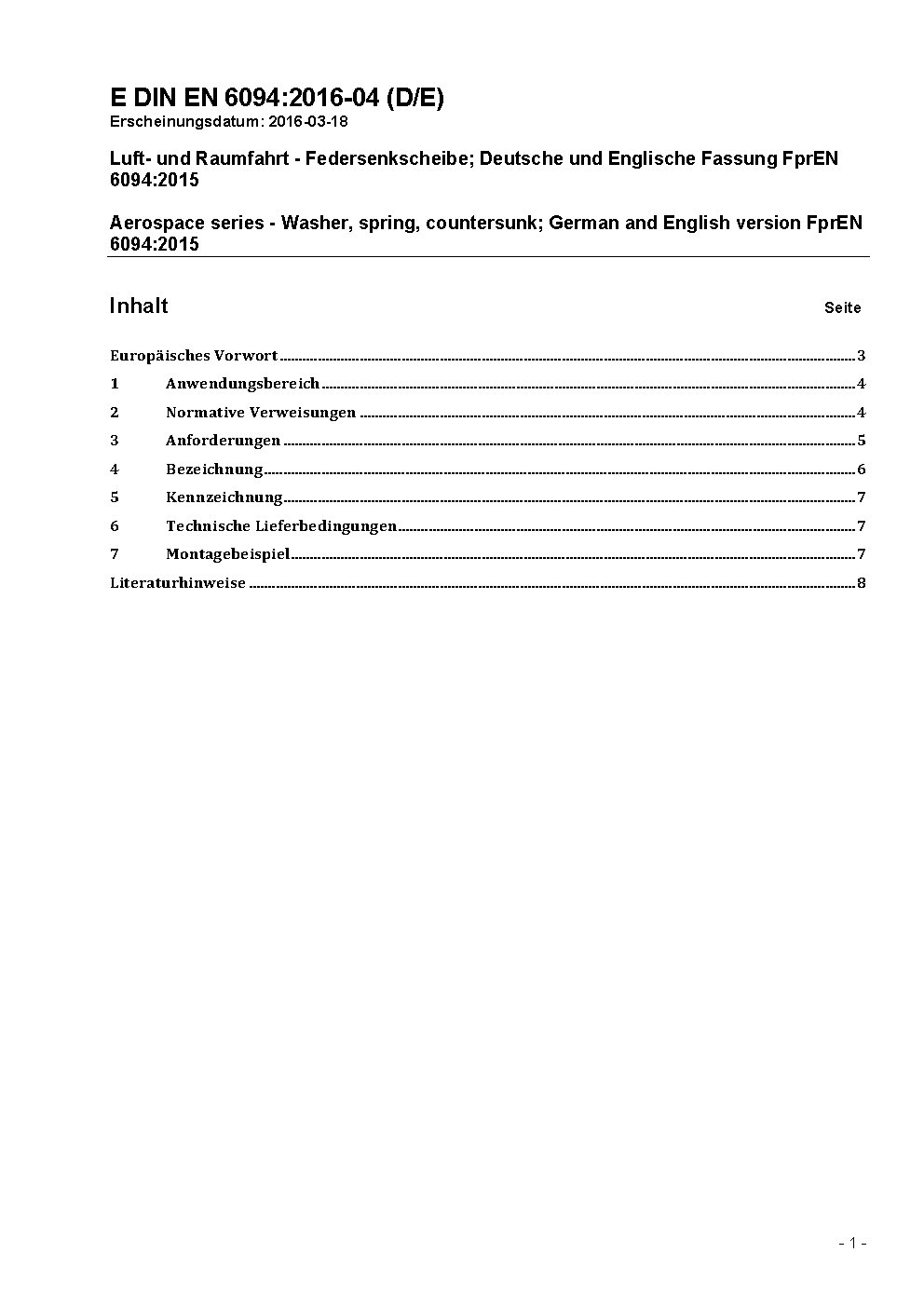 Luft- und Raumfahrt - Federsenkscheibe; Deutsche und Englische Fassung FprEN 6094:2015