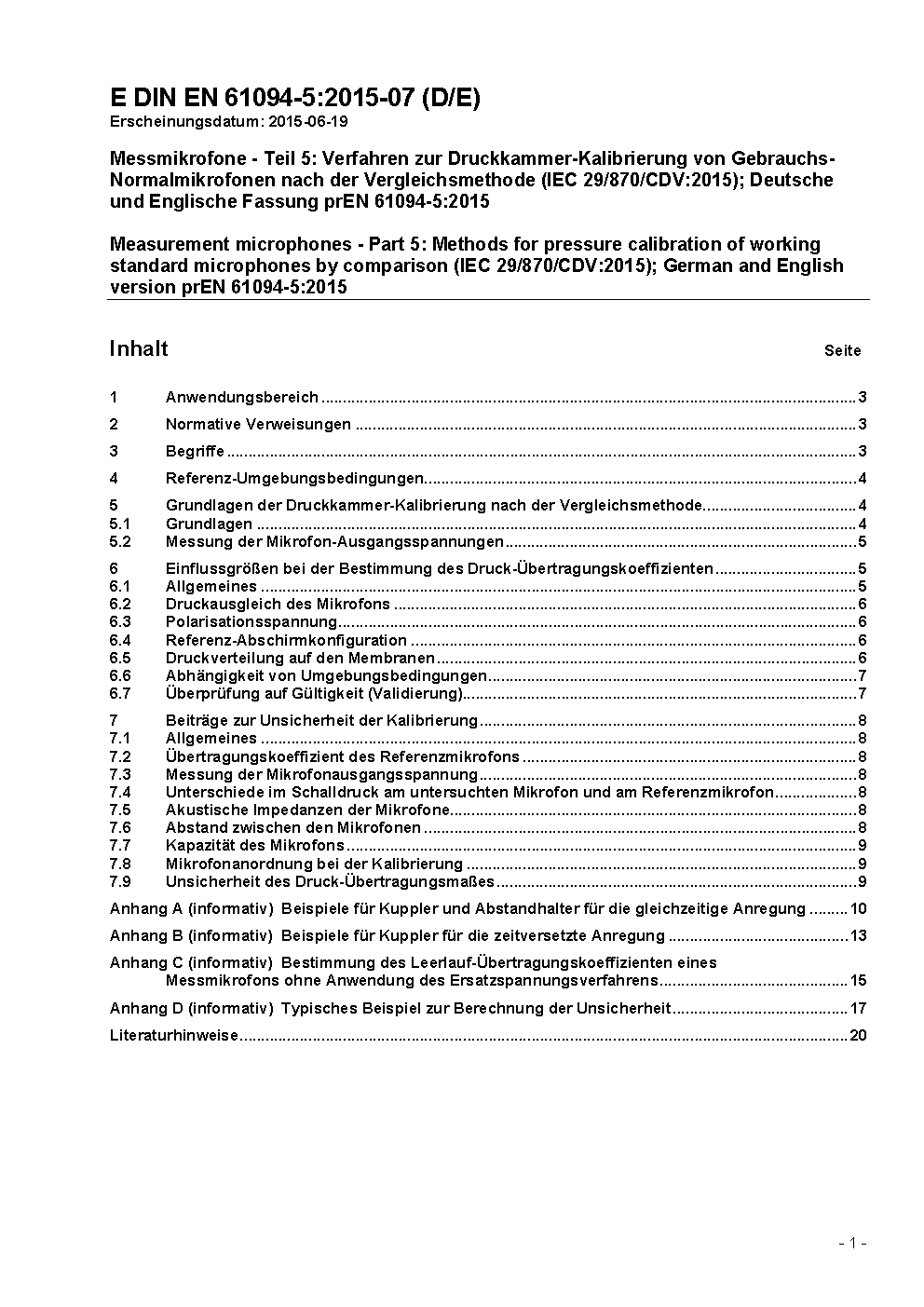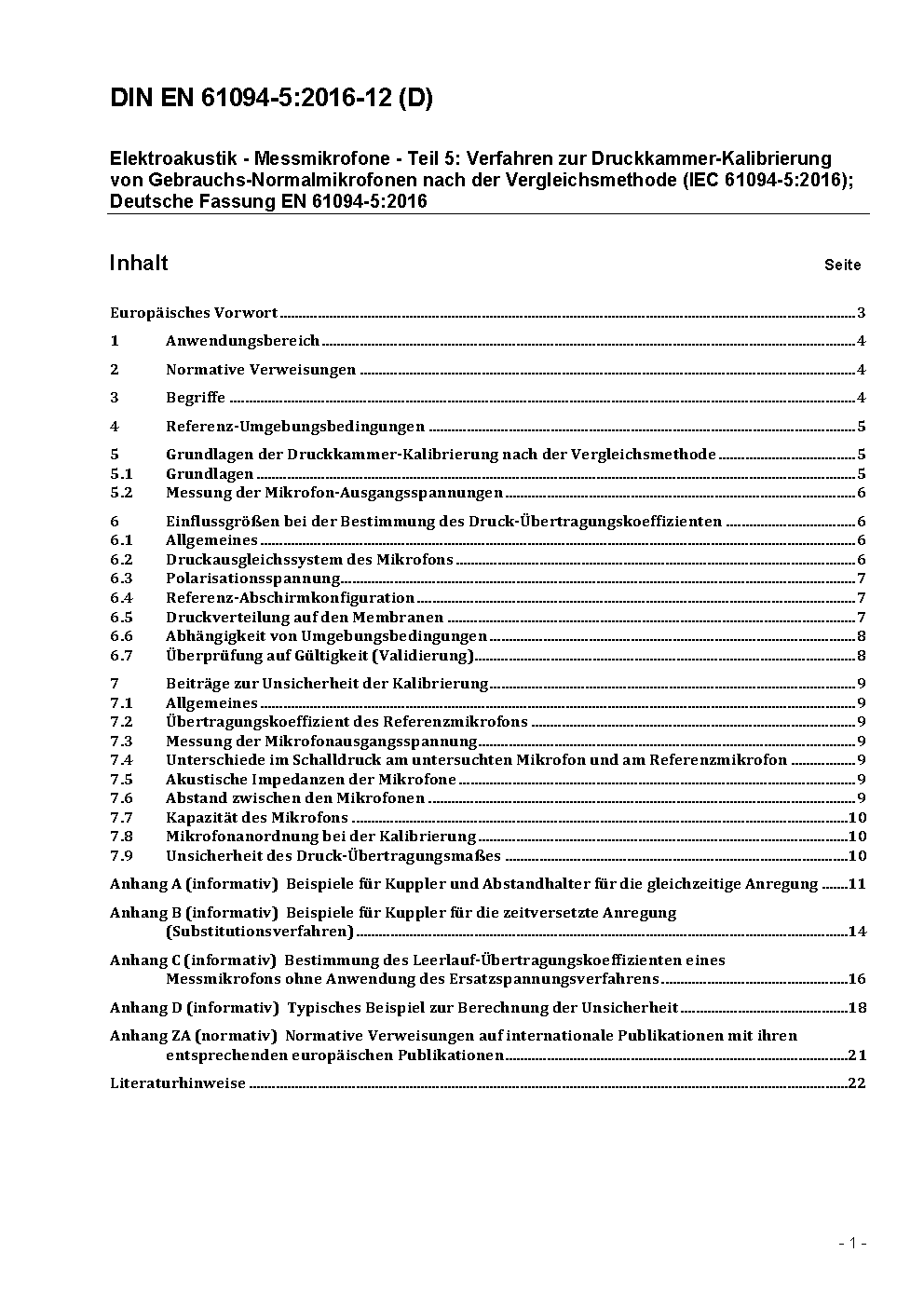 Measurement microphones - Part 5: Methods for pressure calibration of working standard microphones by comparison (IEC 61094-5:2001); German version EN 61094-5:2001