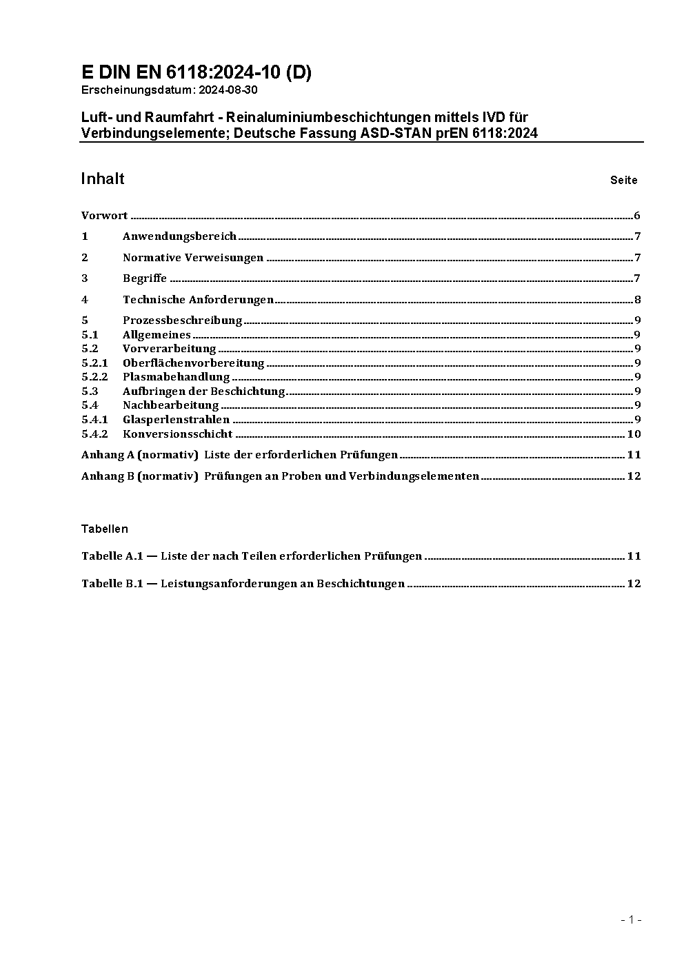 Luft- und Raumfahrt - Reinaluminiumbeschichtungen mittels IVD für Verbindungselemente; Deutsche Fassung ASD-STAN prEN 6118:2024