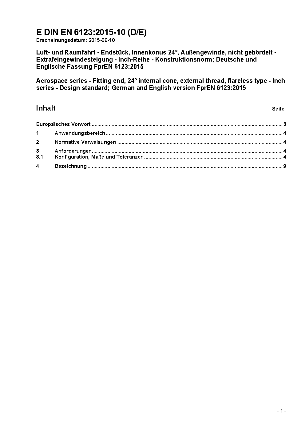 Luft- und Raumfahrt - Endstück, Innenkonus 24°, Außengewinde, nicht gebördelt - Extrafeingewindesteigung - Inch-Reihe - Konstruktionsnorm; Deutsche und Englische Fassung EN 6123:2016