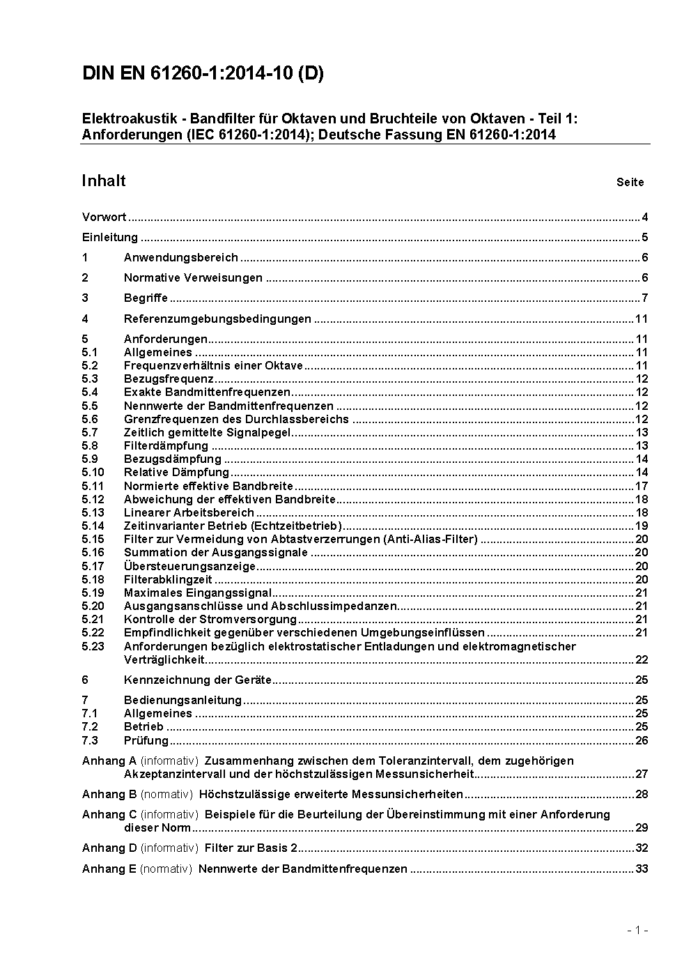 Elektroakustik - Bandfilter für Oktaven und Bruchteile von Oktaven - Teil 1: Anforderungen (IEC 29/748/CDV:2011); Deutsche Fassung prEN 61260-1:2011