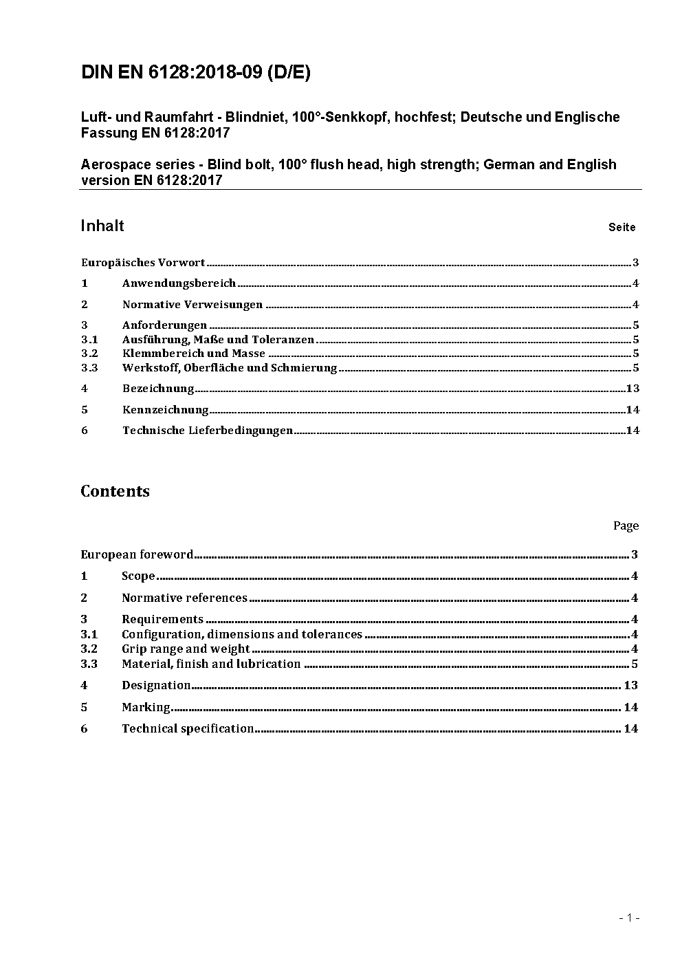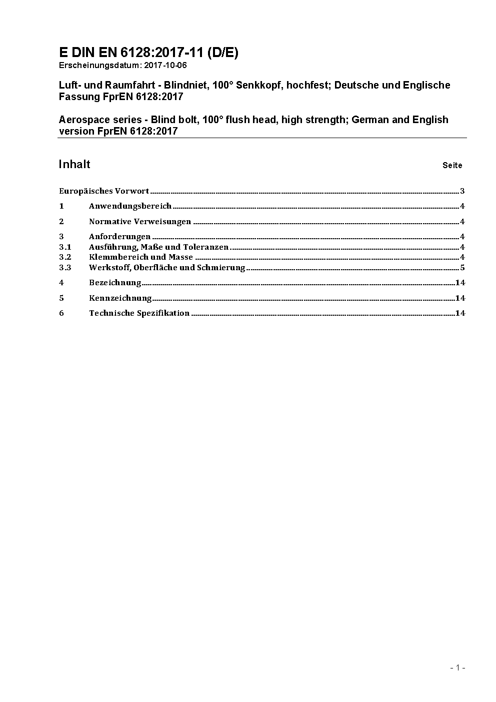 Luft- und Raumfahrt - Blindniet, 100° Senkkopf, hochfest; Deutsche und Englische Fassung FprEN 6128:2017