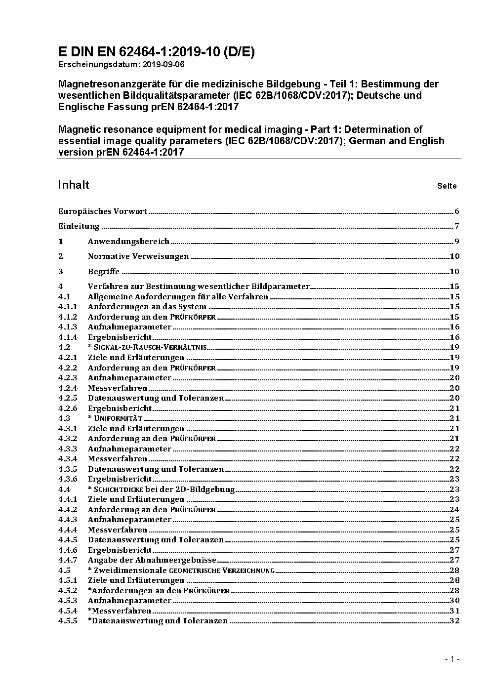 Magnetresonanzgeräte für die medizinische Bildgebung - Teil 1: Bestimmung der wesentlichen Bildqualitätsparameter (IEC 62464-1:2007); Deutsche Fassung EN 62464-1:2007