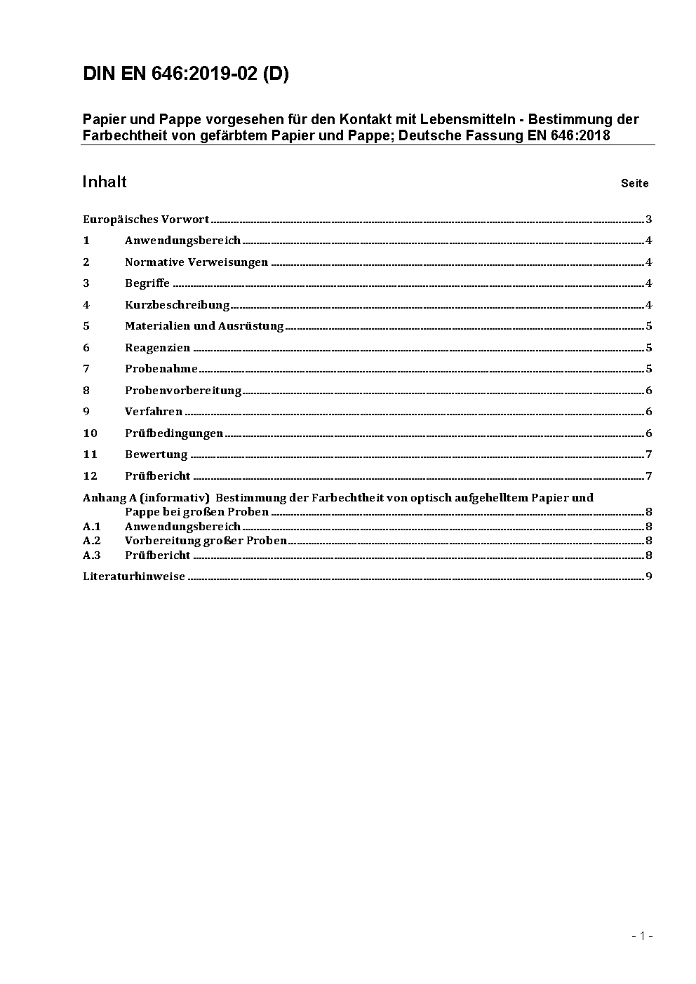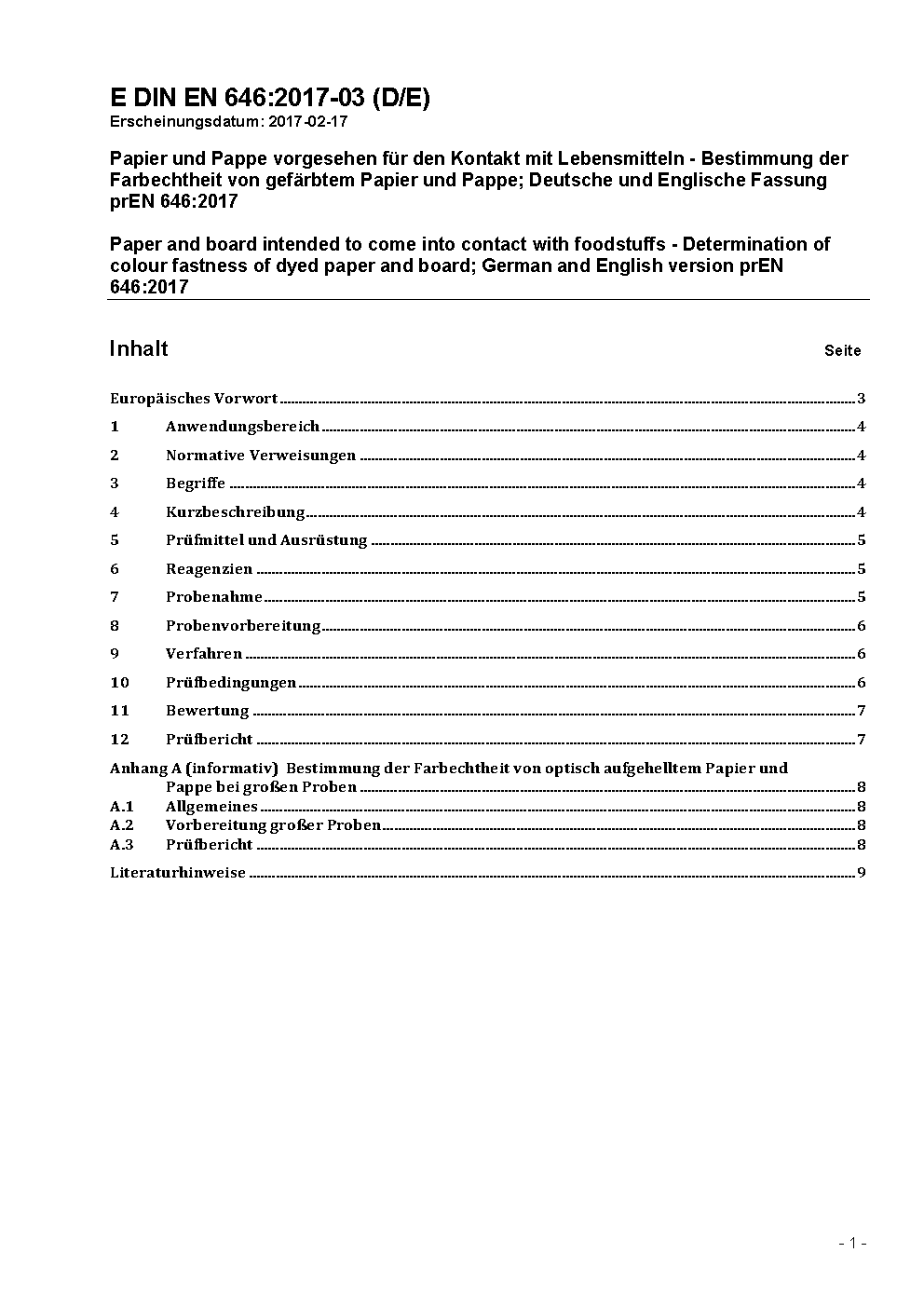 Papier und Pappe vorgesehen für den Kontakt mit Lebensmitteln - Bestimmung der Farbechtheit von gefärbtem Papier und Pappe; Deutsche Fassung EN 646:2006
