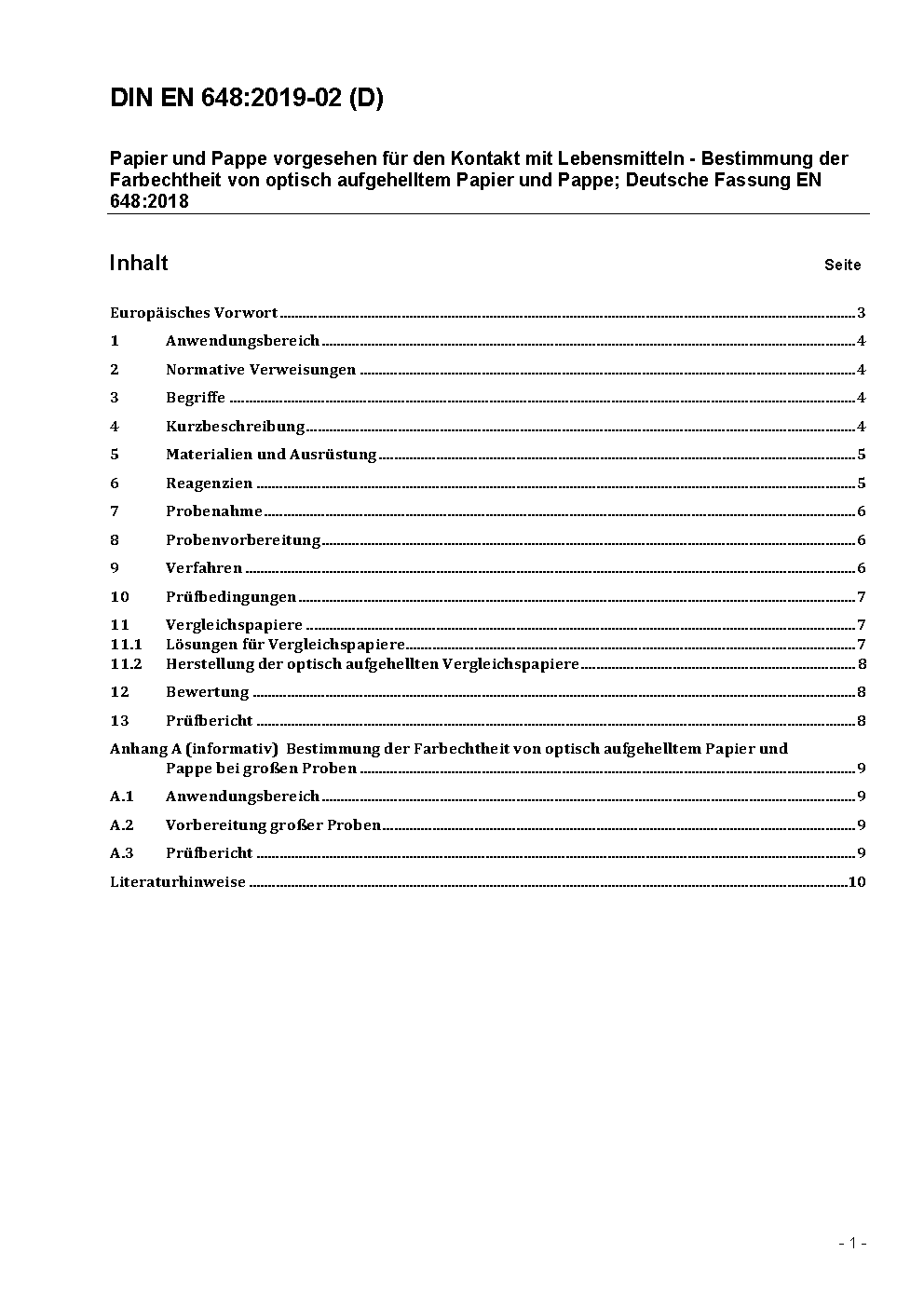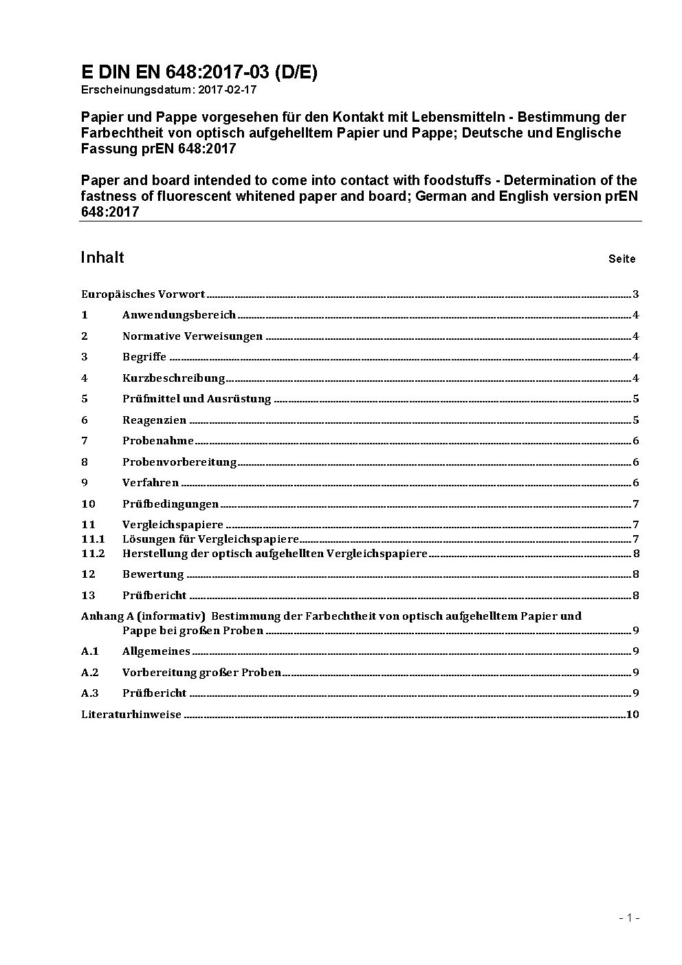 Paper and board intended to come into contact with foodstuffs - Determination of the fastness of fluorescent whitened paper and board; German version EN 648:2003