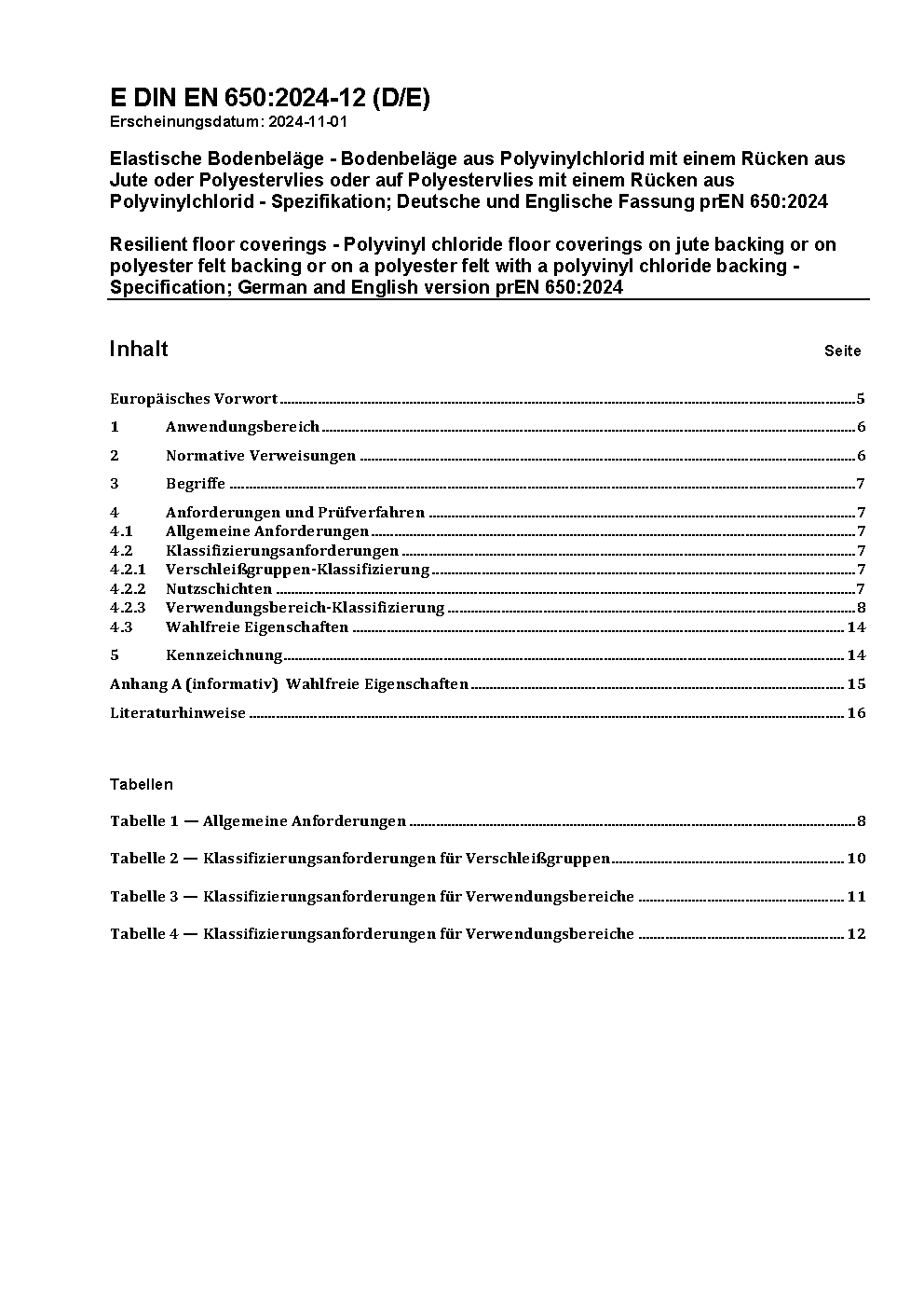 Elastische Bodenbeläge - Bodenbeläge aus Polyvinylchlorid mit einem Rücken aus Jute oder Polyestervlies oder auf Polyestervlies mit einem Rücken aus Polyvinylchlorid - Spezifikation; Deutsche Fassung EN 650:2012