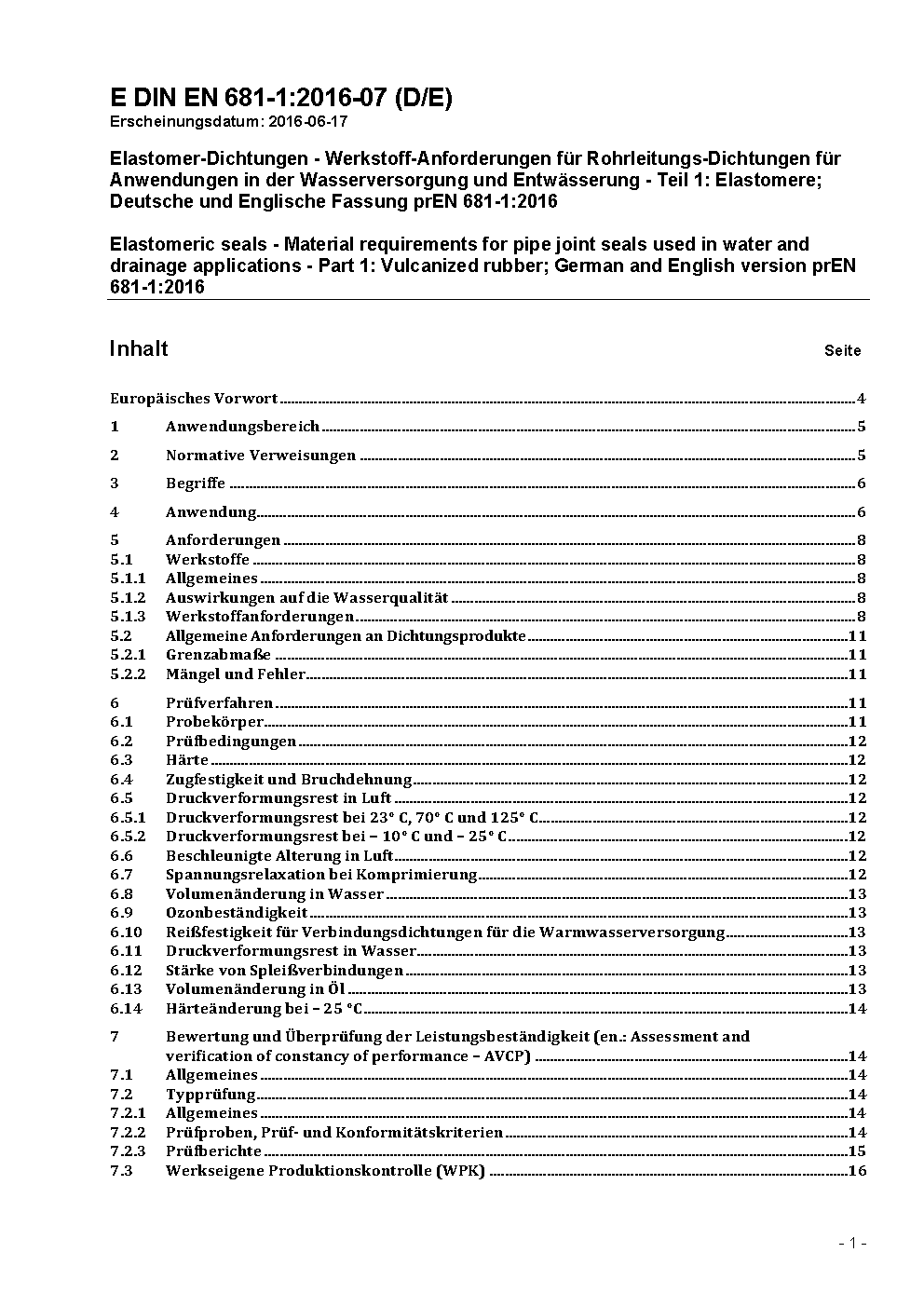 Elastomer-Dichtungen - Werkstoff-Anforderungen für Rohrleitungs-Dichtungen für Anwendungen in der Wasserversorgung und Entwässerung - Teil 1: Elastomere; Deutsche und Englische Fassung prEN 681-1:2016