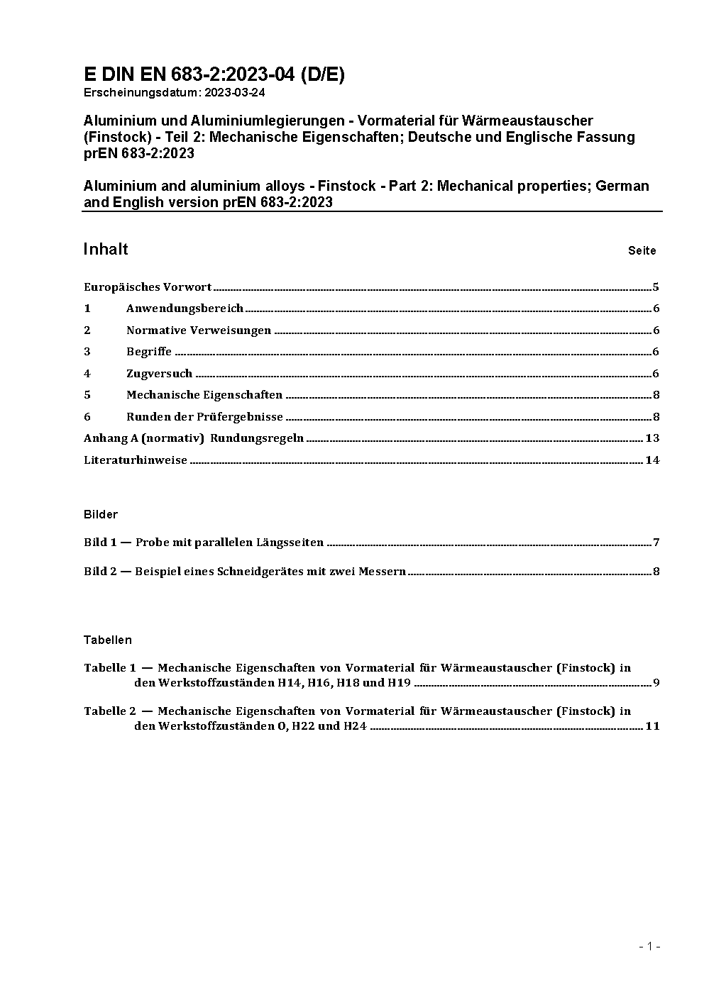 Aluminium und Aluminiumlegierungen - Vormaterial für Wärmeaustauscher (Finstock) - Teil 2: Mechanische Eigenschaften; Deutsche und Englische Fassung prEN 683-2:2023