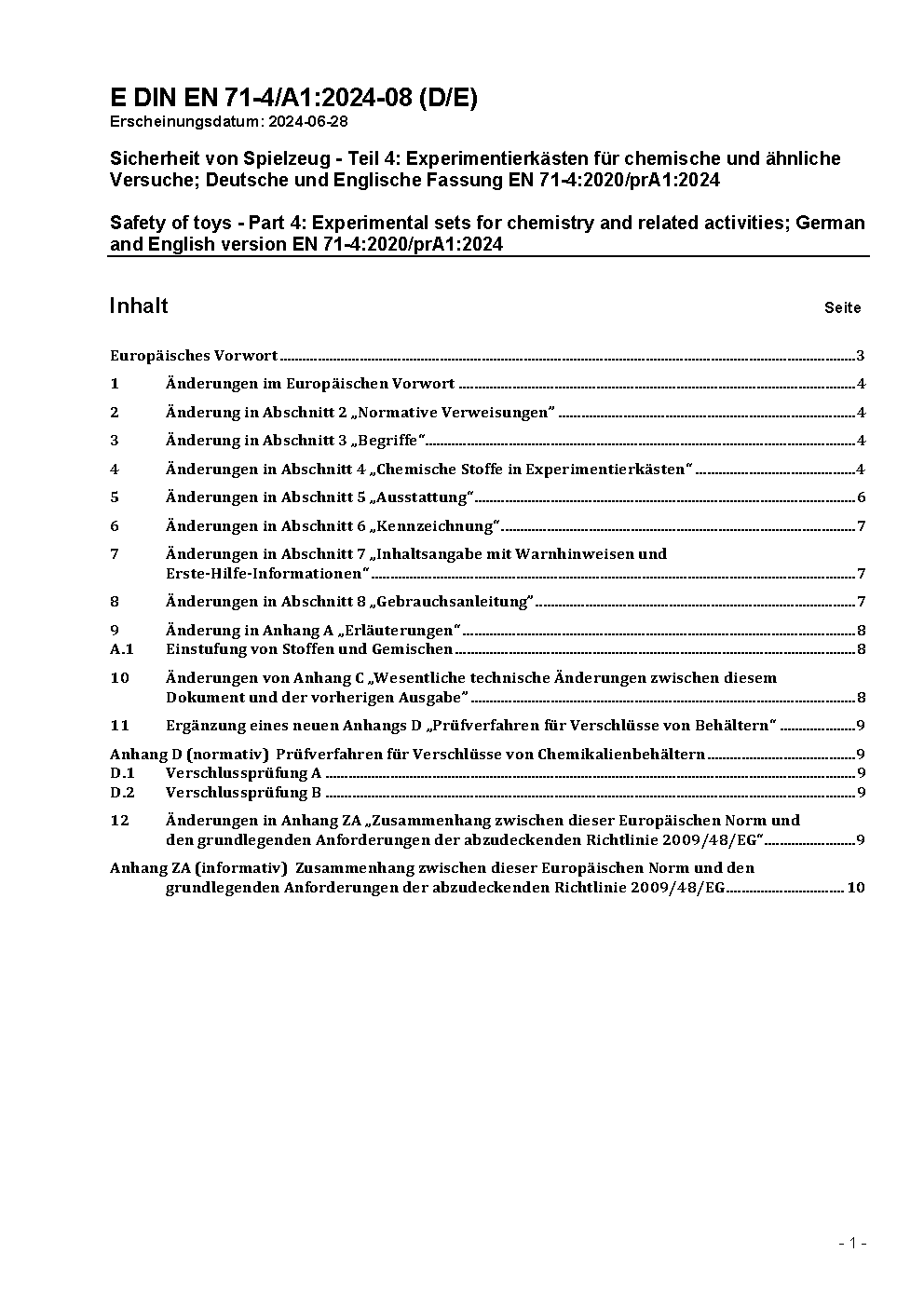 Sicherheit von Spielzeug - Teil 4: Experimentierkästen für chemische und ähnliche Versuche; Deutsche Fassung prEN 71-4:2011