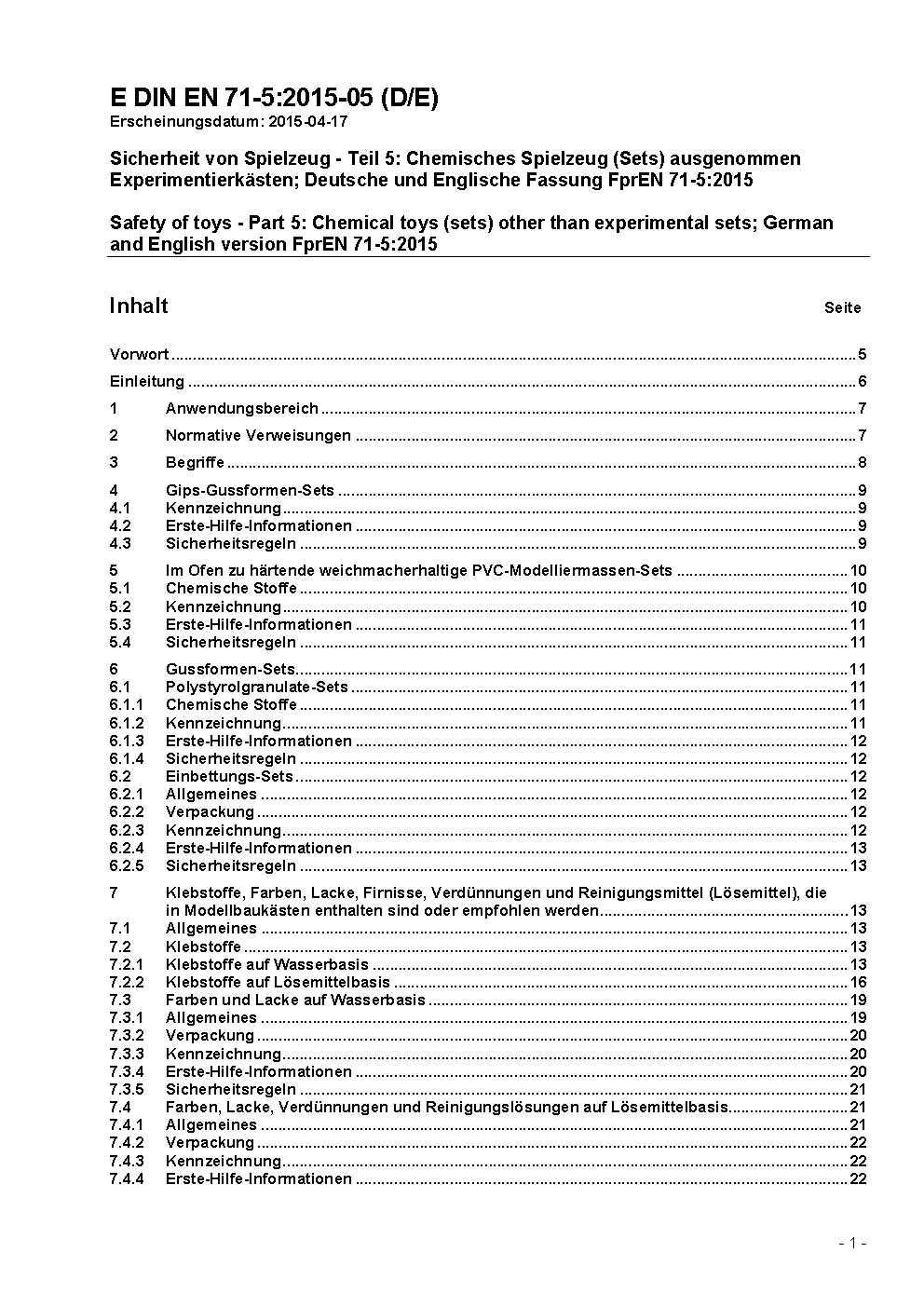 Sicherheit von Spielzeug - Teil 5: Chemisches Spielzeug (Sets) ausgenommen Experimentierkästen; Deutsche Fassung EN 71-5:1993/A1:2006