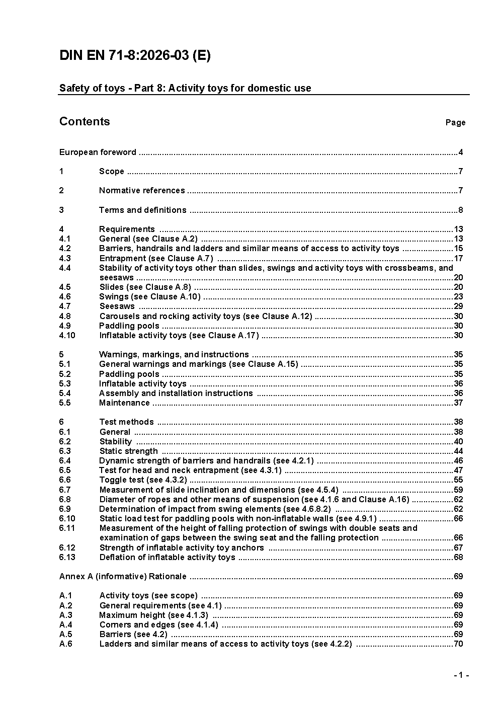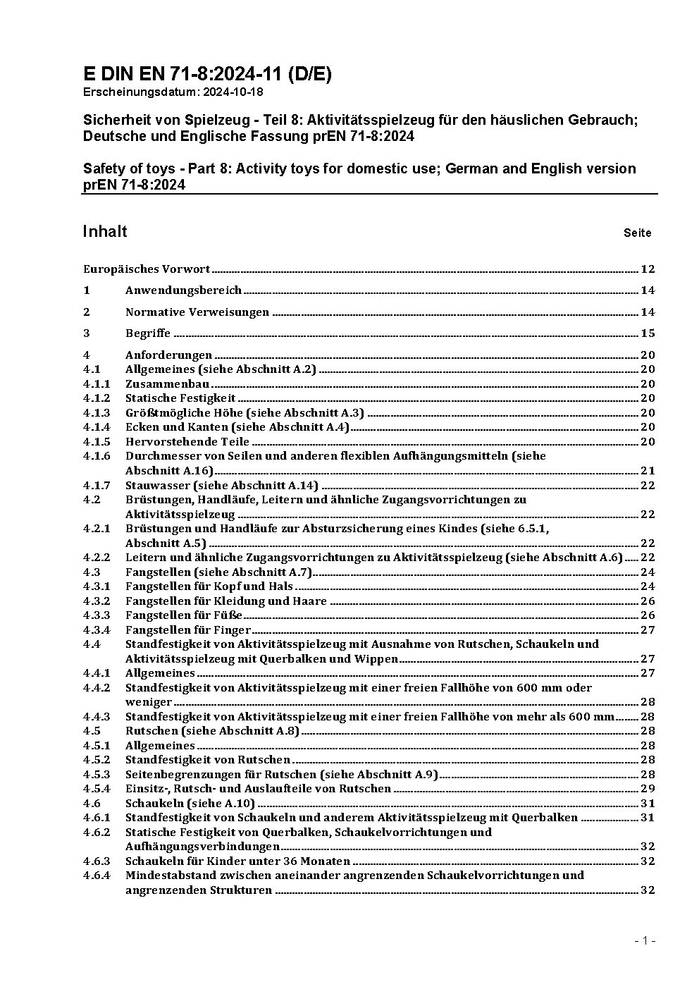 Sicherheit von Spielzeug - Teil 8: Schaukeln, Rutschen und ähnliches Aktivitätsspielzeug für den häuslichen Gebrauch (Innen- und Außenbereich); Deutsche Fassung EN 71-8:2003 / Achtung: Gilt in Verbindung mit DIN EN 71-1 (1998-11)