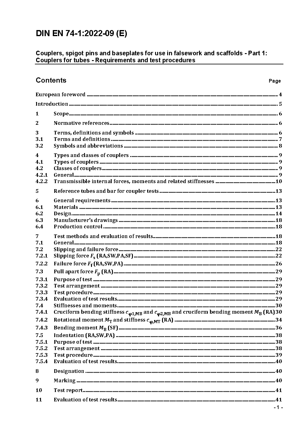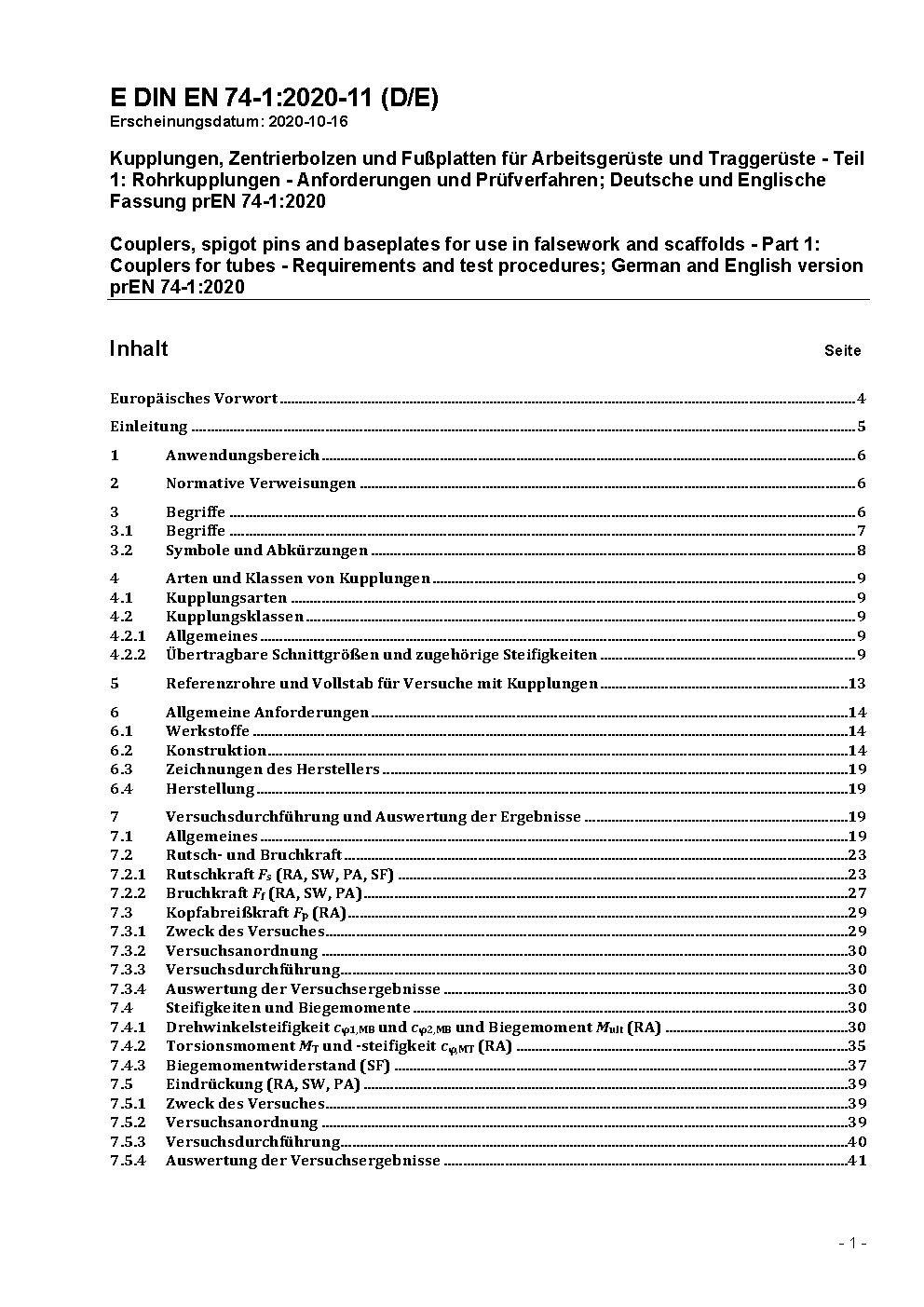 Couplers, spigot pins and baseplates for use in falsework and scaffolds - Part 1: Couplers for tubes - Requirements and test procedures; German and English version prEN 74-1:2020