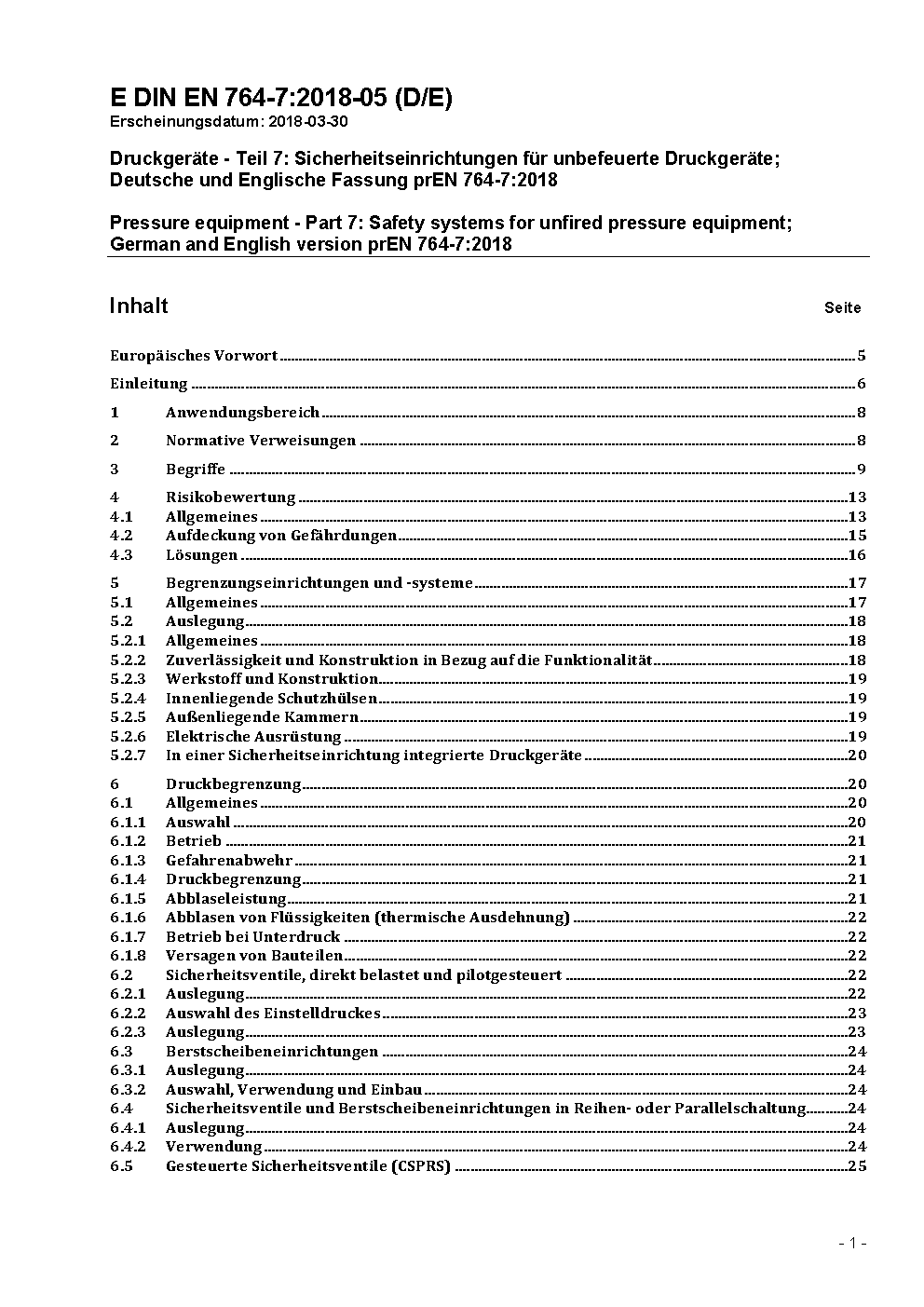Druckgeräte - Teil 7: Sicherheitseinrichtungen für unbefeuerte Druckgeräte; Deutsche und Englische Fassung prEN 764-7:2018