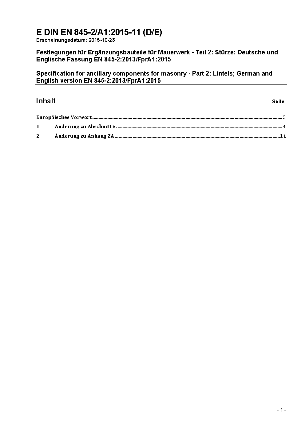 Festlegungen für Hilfsbauteile für Mauerwerk; Teil 2: Stürze; Deutsche Fassung prEN 845-2:1992