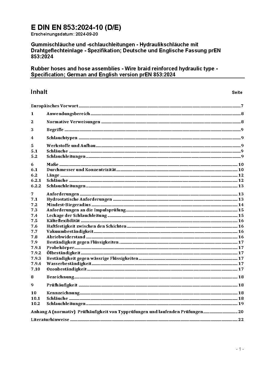 Gummischläuche und -schlauchleitungen - Hydraulikschläuche mit Drahtgeflechteinlage - Spezifikation; Deutsche Fassung EN 853:1996