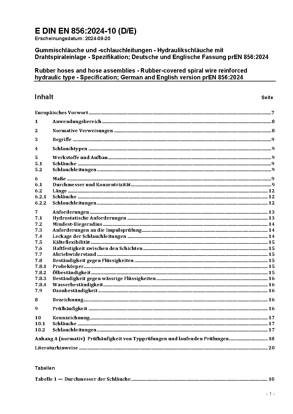Gummischläuche und -schlauchleitungen - Hydraulikschläuche mit Drahtspiraleinlage - Spezifikation; Deutsche Fassung EN 856:1996