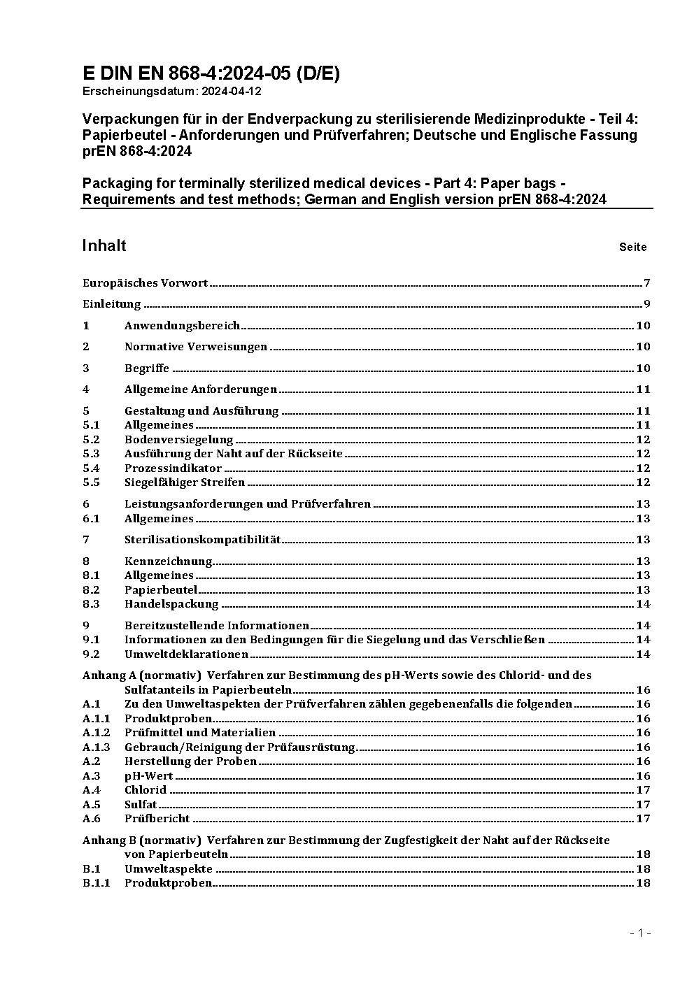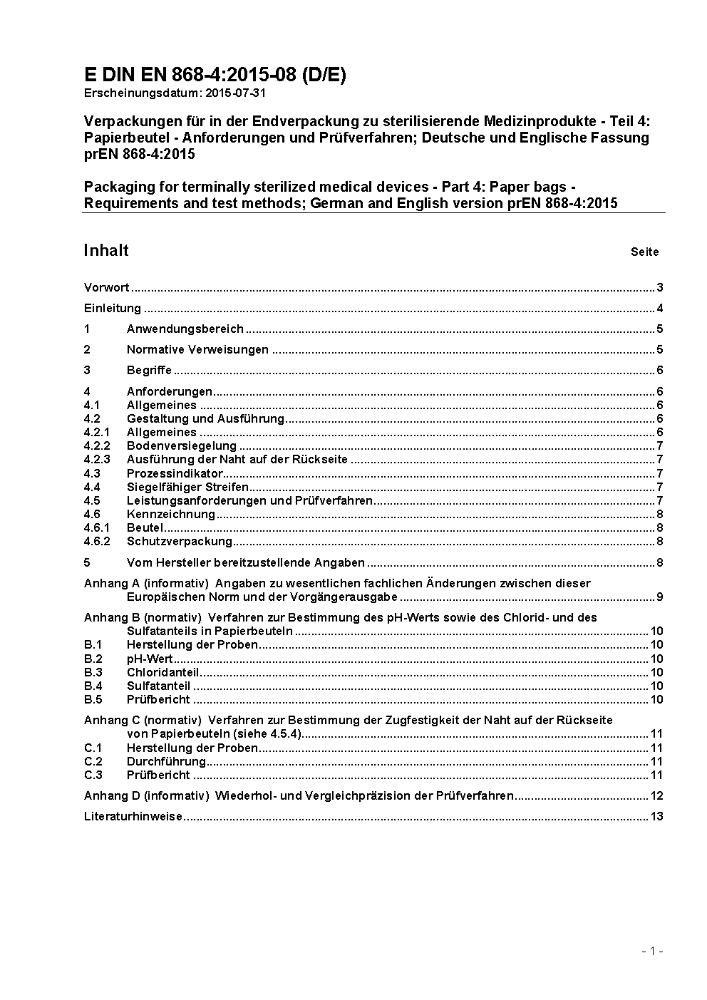 Verpackungen für in der Endverpackung zu sterilisierende Medizinprodukte - Teil 4: Papierbeutel - Anforderungen und Prüfverfahren; Deutsche Fassung EN 868-4:2017