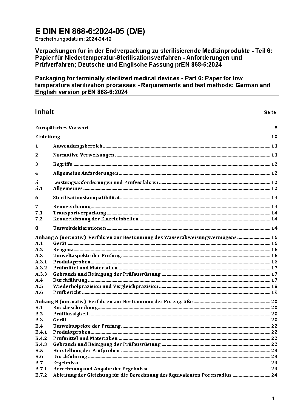 Verpackungen für in der Endverpackung zu sterilisierende Medizinprodukte - Teil 6: Papier für Niedertemperatur-Sterilisationsverfahren - Anforderungen und Prüfverfahren; Deutsche Fassung EN 868-6:2017