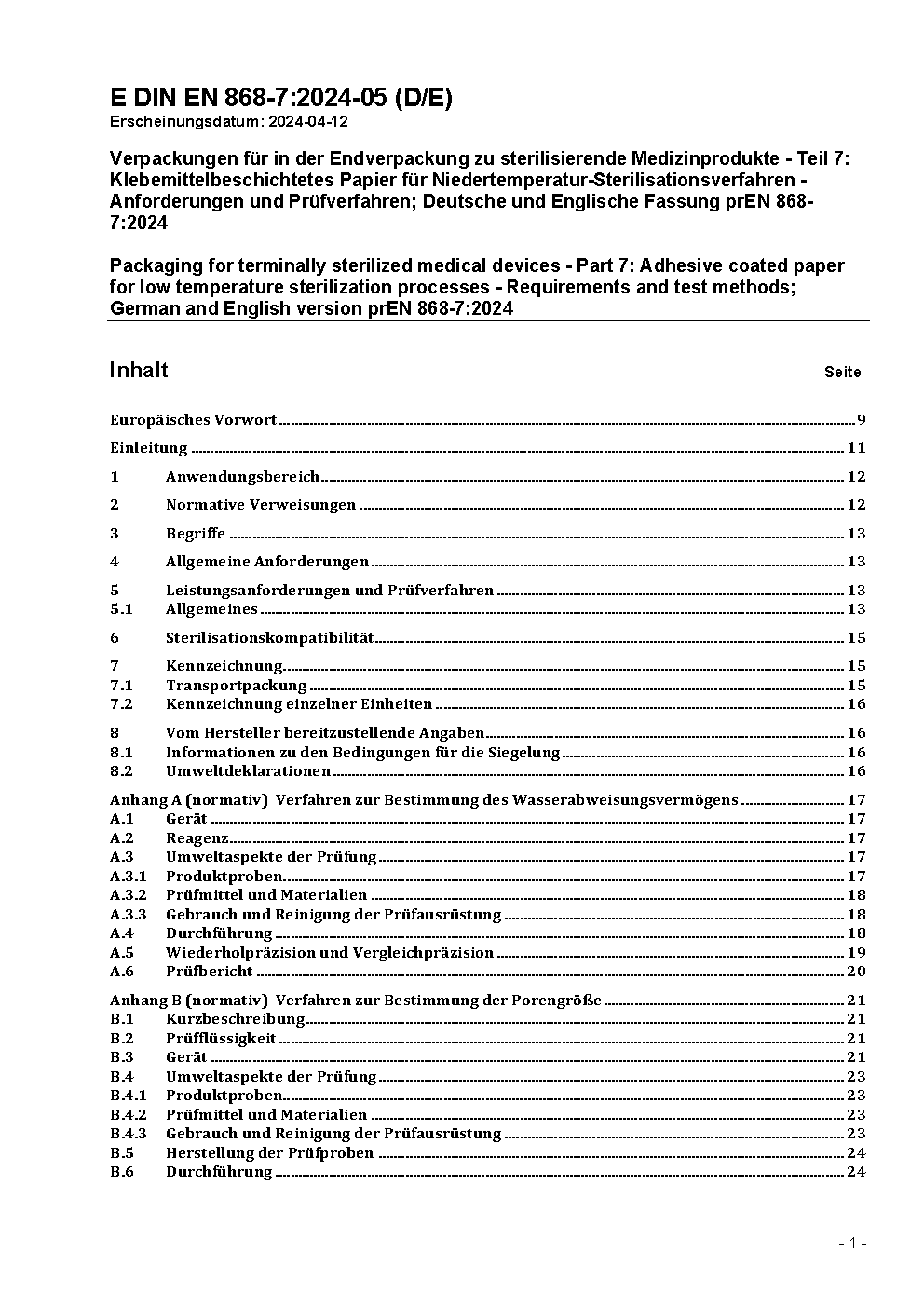 Verpackungen für in der Endverpackung zu sterilisierende Medizinprodukte - Teil 7: Klebemittelbeschichtetes Papier für Niedertemperatur-Sterilisationsverfahren - Anforderungen und Prüfverfahren; Deutsche Fassung EN 868-7:2017