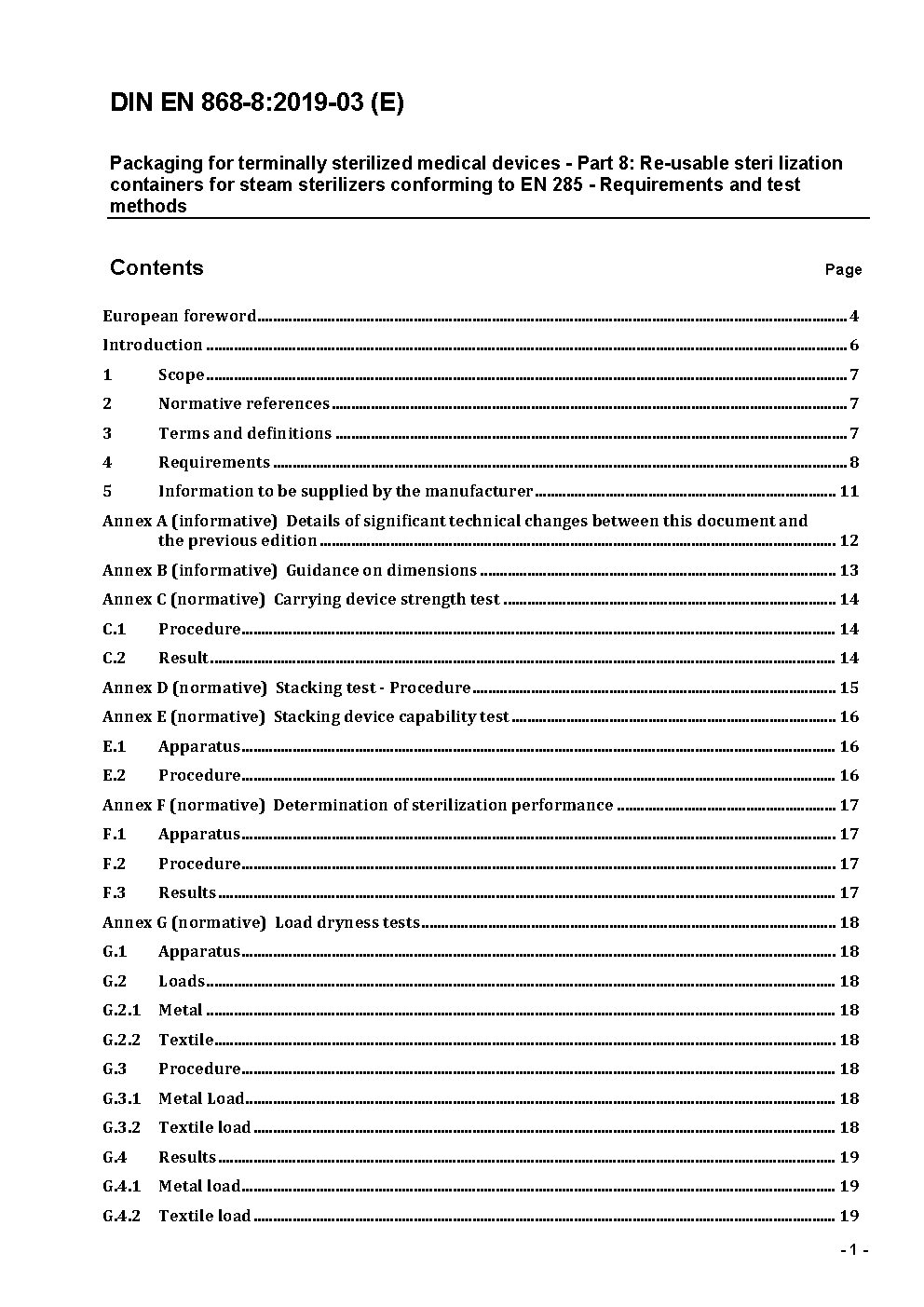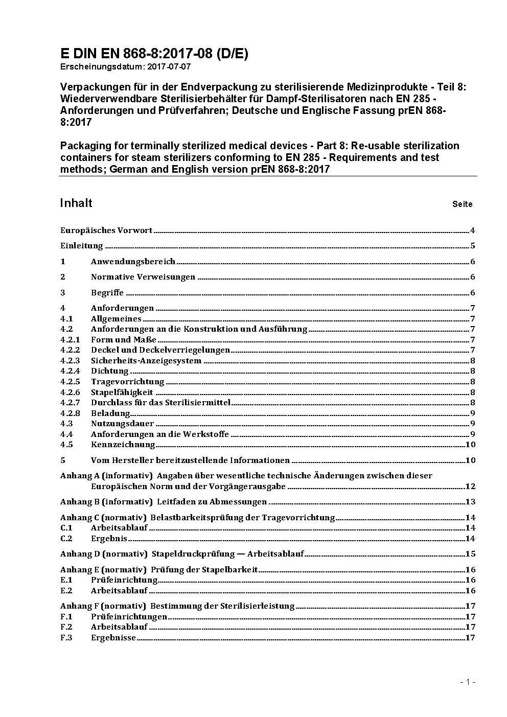 Verpackungen für in der Endverpackung zu sterilisierende Medizinprodukte - Teil 8: Wiederverwendbare Sterilisierbehälter für Dampf-Sterilisatoren nach EN 285 - Anforderungen und Prüfverfahren; Deutsche und Englische Fassung prEN 868-8:2017