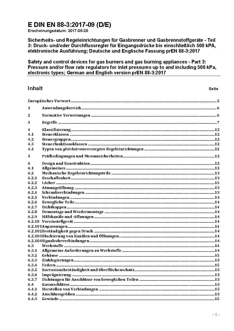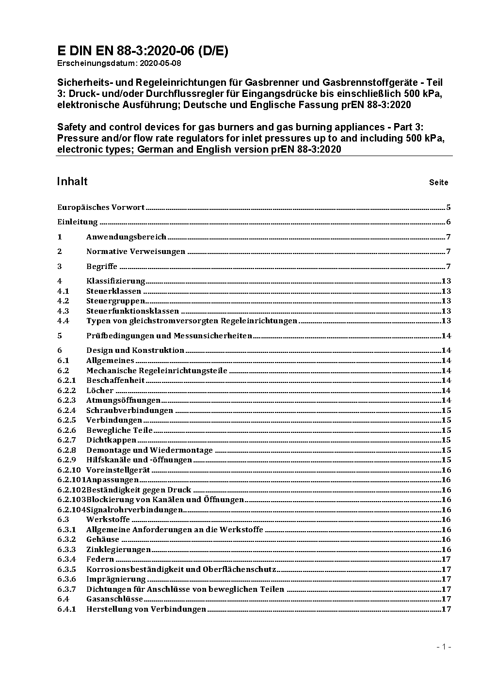 Sicherheits- und Regeleinrichtungen für Gasbrenner und Gasgeräte - Teil 3: Druck- und/oder Durchflussregler für Eingangsdrücke bis einschließlich 500 kPa, elektronische Ausführung; Deutsche Fassung EN 88-3:2022+A1:2024 / Achtung: Daneben gilt DIN EN 88-3 (2024-02) noch bis 2027-11-30.