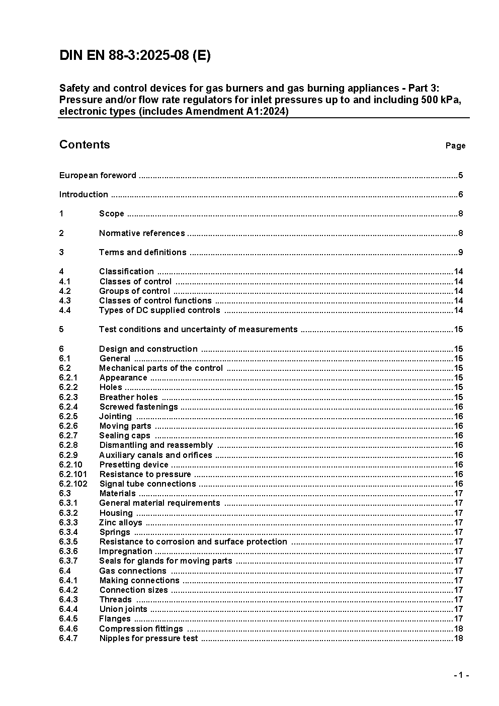 Safety and control devices for gas burners and gas burning appliances - Part 3: Pressure and/or flow rate regulators for inlet pressures up to and including 500 kPa, electronic types; German version EN 88-3:2022+A1:2024.