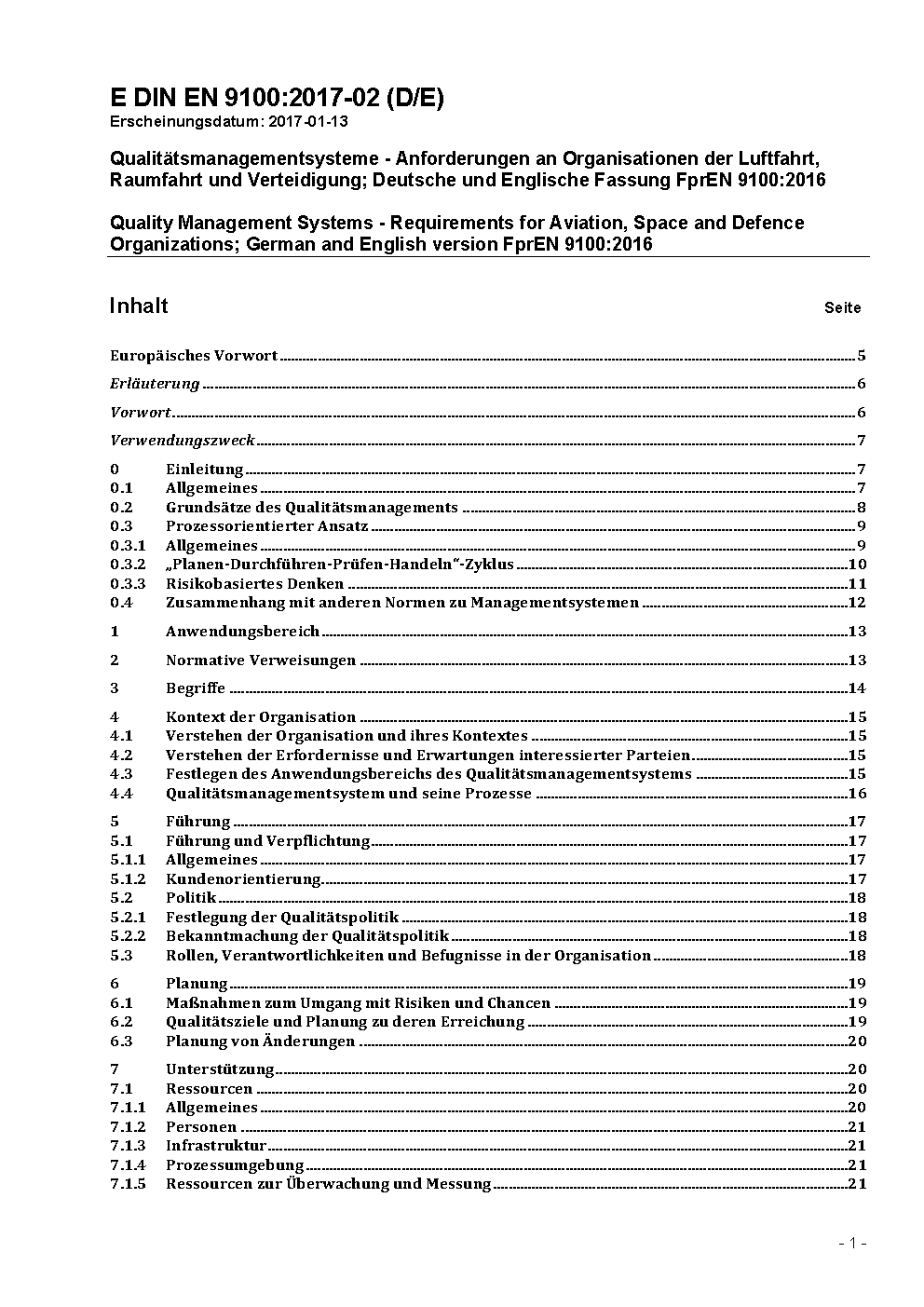 Quality Management Systems - Requirements for Aviation, Space and Defence Organizations; German and English version EN 9100:2018
