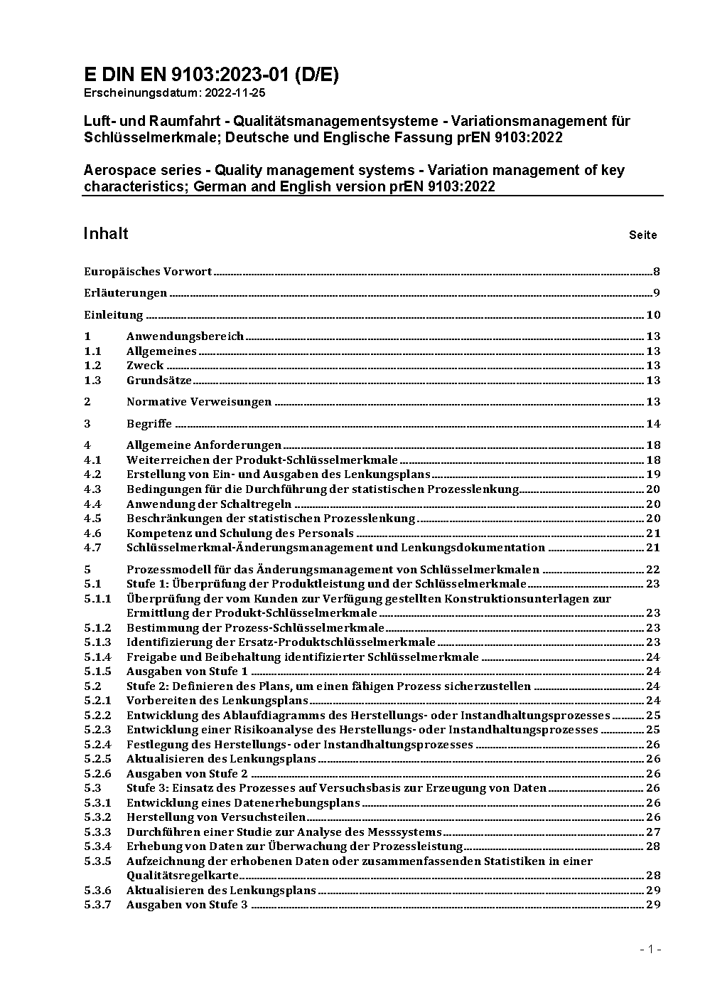 Aerospace series - Quality management systems - Variation management of key characteristics; German and English version prEN 9103:2022