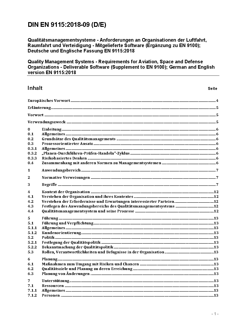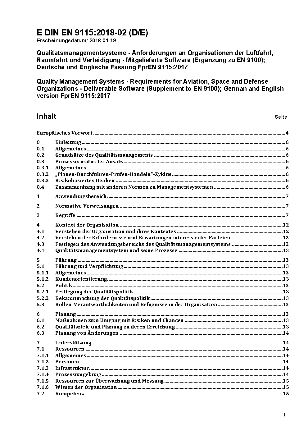 Quality Management Systems - Requirements for Aviation, Space and Defense Organizations - Deliverable Software (Supplement to EN 9100); German and English version FprEN 9115:2017